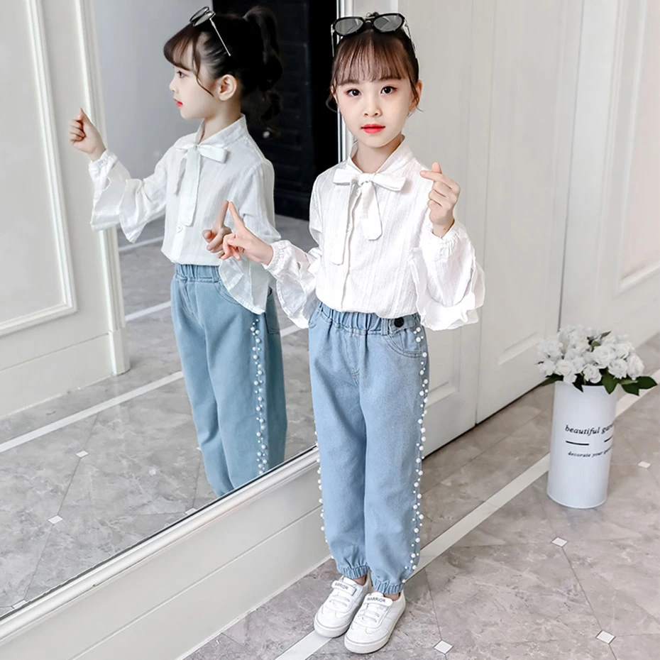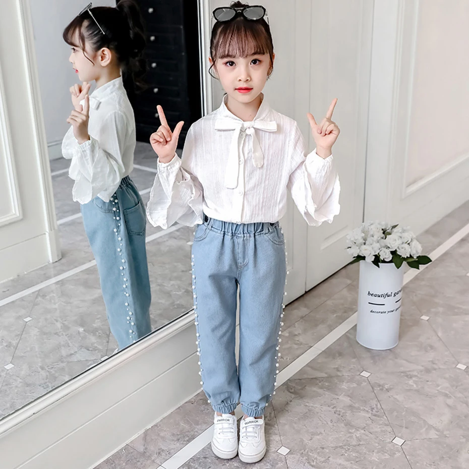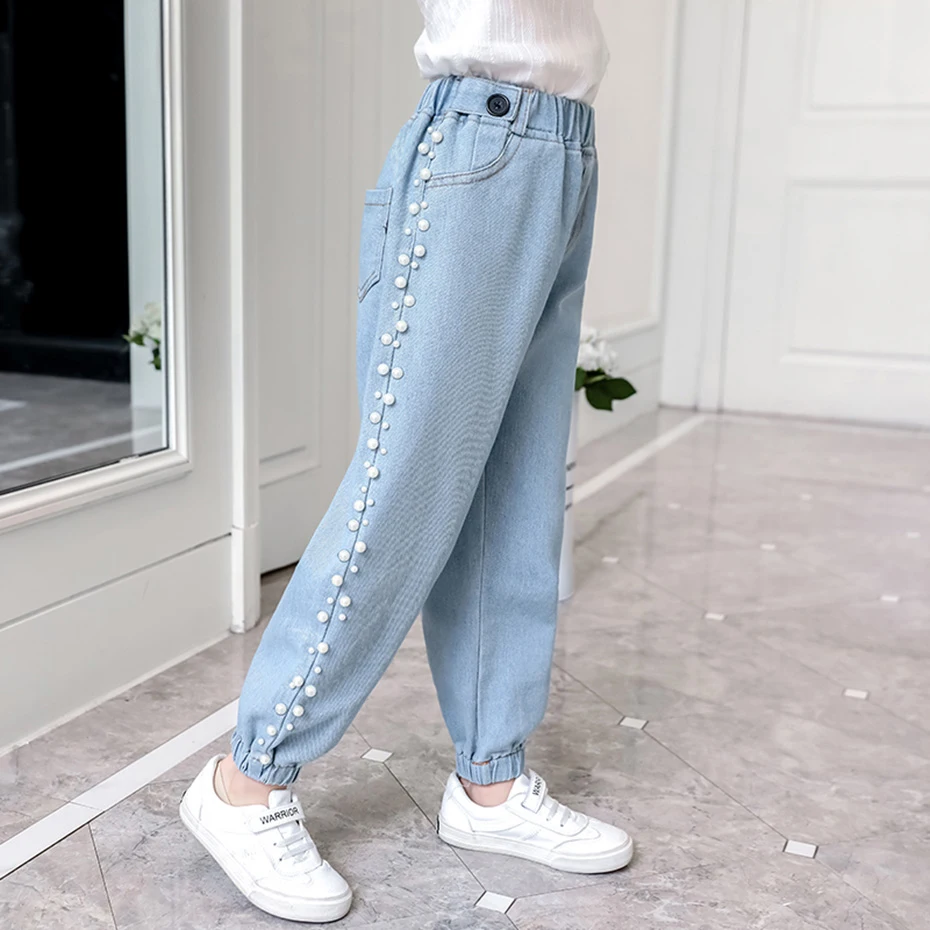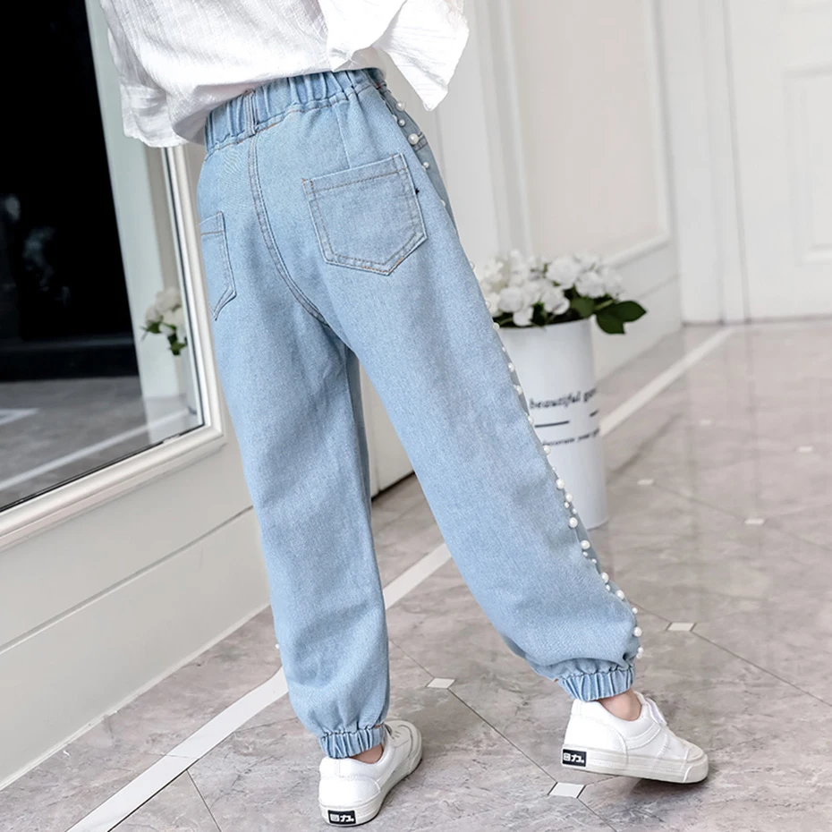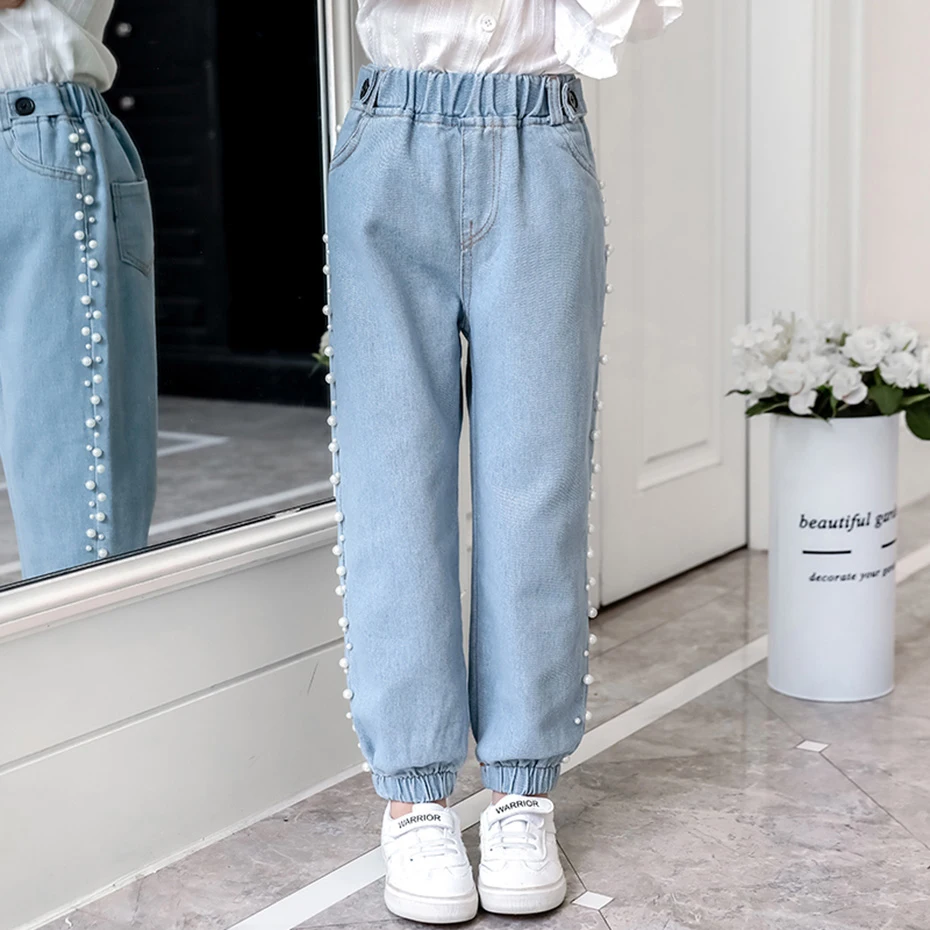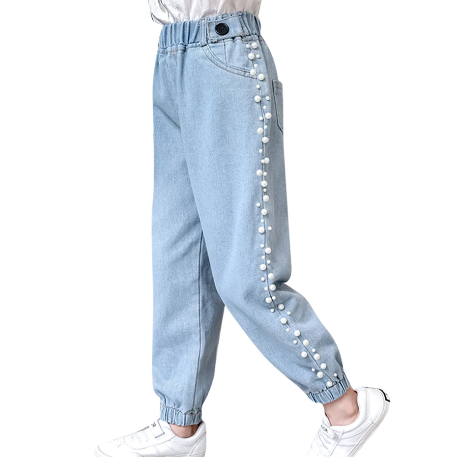 Джинсы для девочек однотонные джинсы для девочек с жемчугом джинсовые брюки для детей Повседневная стильная детская одежда 6 8 10 12 14