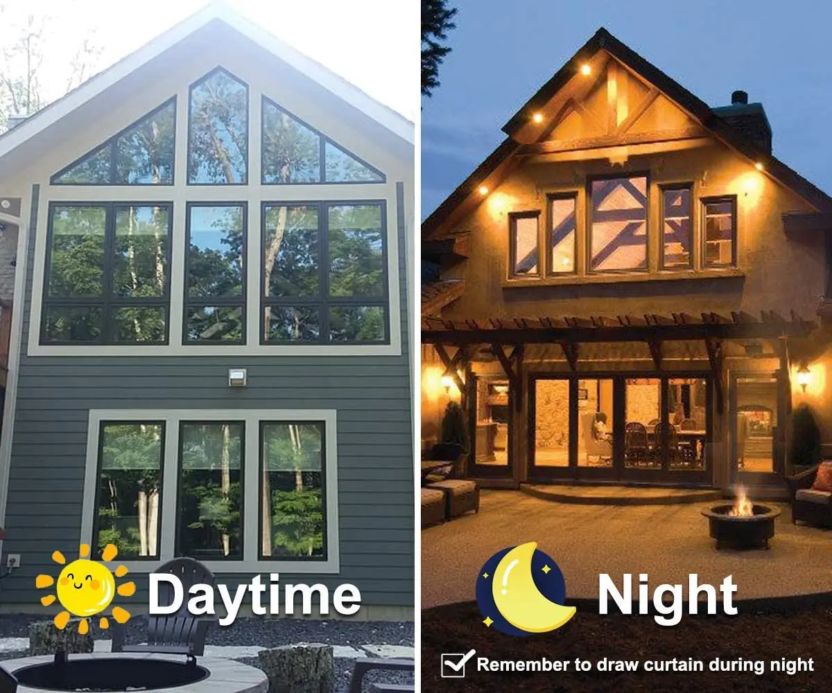 3.Различные эффекты в дневное и ночное время:Внешнее стекло покажет зеркальный эффект, а такжеСохраняйте конфиденциальность в дневное время(Если люди, находящиеся снаружи, находятся вблизи, они не полностью невидимы изнутри). Ночью наружное стекло потеряет зеркальный эффект, а люди снаружи могут видеть внутри. Поэтому,Шторы необходимы ночью.