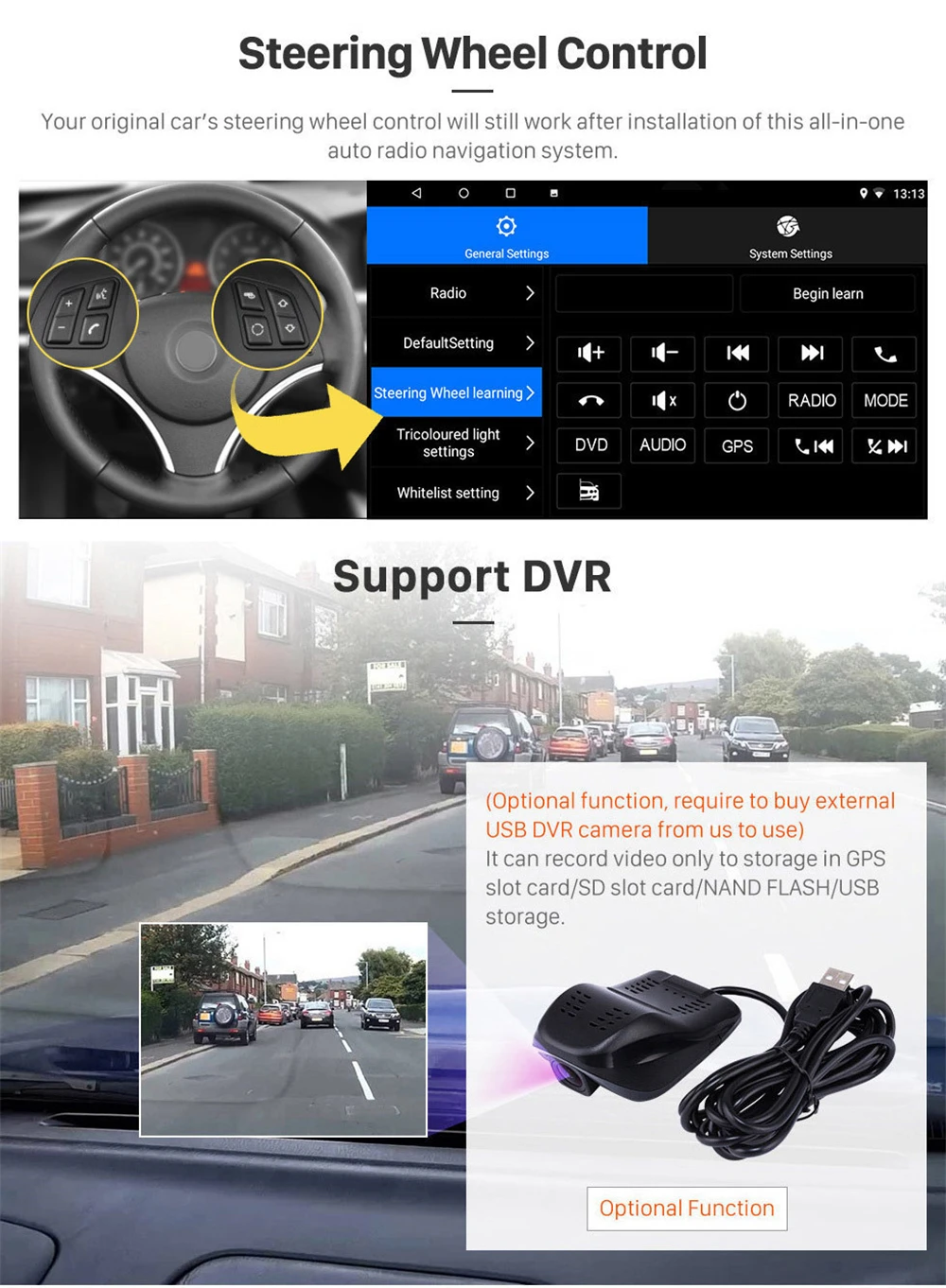 ОС: Операционная система Android 10RAM + ROM: 1G + 16G 2G + 16G 2G + 32GПоскольку система занимает внутреннюю память, операционная система занимает около 4-6 ГБ памяти.ЦП: четырехъядерныйПоддержка изменить логотип логотипаРазъем питания: подключи и работайВстроенный GPS-Поддержка 2D HD и 3D картРазрешение: 2.5D HD 1024*600 пикселей емкостный экран--- Поддержка внешнего мобильного U диска--- Интернет развлечения, встроенный WiFi модуль.--- Поддержка HD 1080p видеоигр, поддержка зеркального соединения.--- Радио: fm-радиоЯзыки: испанский, немецкий, упрощенный китайский, традиционный китайский, французский, английский Японский Корейский Тайский Турецкий греческий корейский польский датский голландский Чешский румынский малайский шведский Словацкий иврит вьетнамский финский и т. Д.Функция двойной зоны (пользователь может слушать музыку или радио в режиме gps-навигации)--- Встроенный Bluetooth handsfree и телефонная книга, поддержка A2DP, воспроизведение музыки напрямую по телефону. (Вы должны согласиться с авторизацией телефона и синхронизировать контактную информацию в настройках телефона)Совместимость с управлением рулевого колеса--- Высокомощный стерео аудио выход, поддерживает динамики---- Вход камеры заднего видаОбратите внимание: эта модель не имеет функции DVD / CD, но поддерживает жесткий диск мобильного USB / U диска.Поддержка USB DVR (опционально)DAB + Поддержка (опционально)Поддержка TMPS (опционально)Поддержка OBD (опционально)Эта посылка включает в себя:1 Автомобильный Android GPS медиаплеер2 usb кабеля1 Антенна gps1 кабель RCA1 Кабель-адаптер1 входной кабель камеры