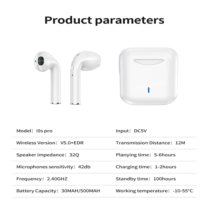 I9s TWS, беспроводные наушники, Bluetooth 5,0, наушники, Air, спортивные, гарнитура с громкой связью, с зарядным боксом для IPhone, IOS, Android Особенности продукта: Версия Bluetooth: 5,0 версия Дальность передачи: наружное прямое расстояние 10-18 метров Емкость батареи: литий-полимерный аккумулятор 50 мАч Цвет: черный, белый, розовый, синий, желтый, красный Зарядным устройством Емкость батареи: 300 мА/ч, прослушивания музыки время: 2,5 часов, следующая/Предыдущая песня/приостановить воспроизведение Время работы в режиме разговора: 2 часа Время работы в режиме ожидания: 130 часов Время зарядки: 1-2 часа Метод сопряжения: Длительное нажатие и запуск синий светильник быстро мигает-это обычный режим сопряжения. После включения, продолжайте нажимать в течение трех секунд, пока синий светильник не начнет мигать быстро. В это время звуковой сигнал издает паринг, а затем входит в состояние бинаурального сопряжения. Синий светильник медленно мигает после успешного сопряжения. Звуковой сигнал: Включение сигнала: Включение питания Подсказка выключения: выключение питания Советы о состоянии сопряжения: Сопряжение Подсказка подключения: устройство подключено Подсказка о отключении: устройство отключено Подсказка низкого заряда батареи: Низкий уровень заряда батареи Ключевые функции: Длительное нажатие, чтобы включить, длительное нажатие, чтобы выключить, нажмите музыкальную паузу/воспроизведение/ответ на вызов/повесить трубку, дважды щелкните следующую песню. Инструкции по зарядке: Индикатор зарядки гарнитуры: Красный светильник для зарядки гарнитуры включен, красный светильник выключен, когда аккумулятор полностью заряжен. Инструкции по зарядному устройству: 1. При зарядке гарнитура с зарядкой чехол: зеленый светодиодный светильник на зарядный чехол мигает, и зеленый светодиодный светильник не погаснет в тех случаях, когда гарнитура аккумулятор полностью заряжен. 2. При зарядке зарядного устройства: зеленый светодиодный светильник на зарядном устройстве мигает, и зеленый светодиодный светильник включен после того, как зарядная коробка заполнена. Ваш заказ содержит: Зарядный кабель X1 Bluetooth-гарнитура X2 Руководство по эксплуатации X1