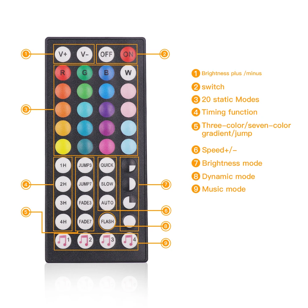 Режим управления: ИК-пульт с 44 кнопками и приложение Bluetooth (функции: вкл/выкл светильник, яркость, Скорость мигания, синхронизация музыки и т. д.)