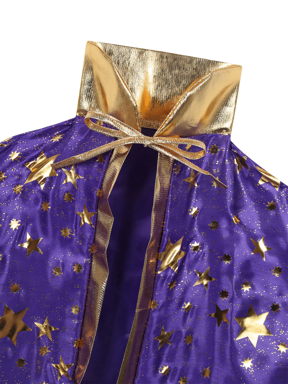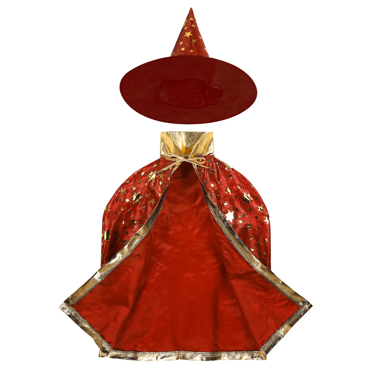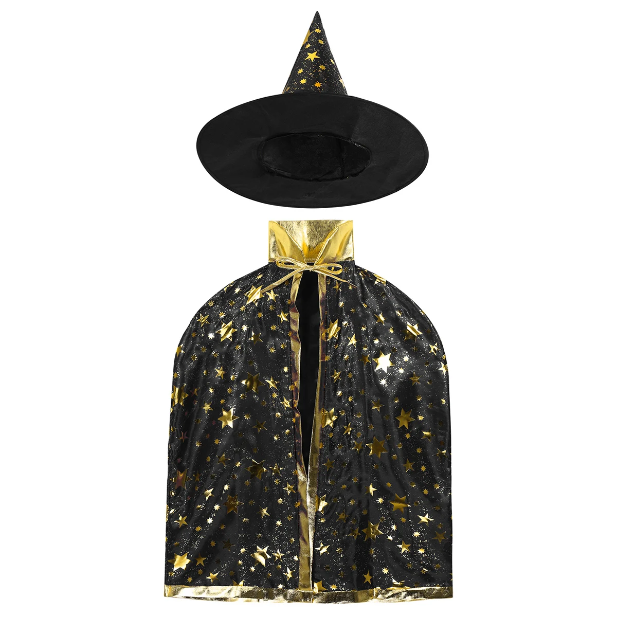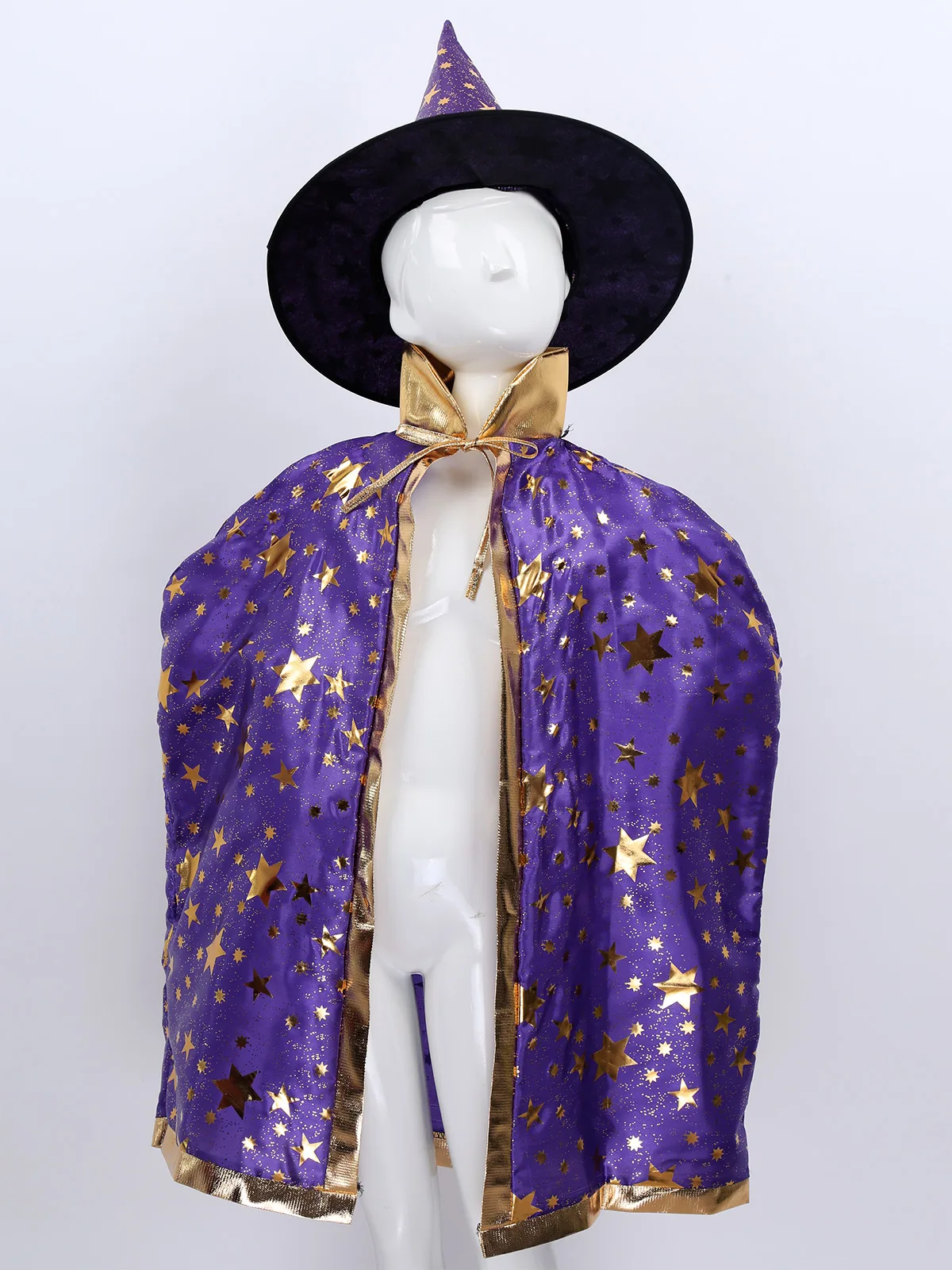 Особенности: Костюмы на Хэллоуин; Костюм для косплея; Накидка волшебника ведьмы с шапкой для детей. Изготовлен из качественного полиэстера, мягкий, удобный, приятный для кожи, не легко деформируется. Принт со звездами золотого цвета; Стиль унисекс; Один размер подходит для большинства детей. С воротником из пенопласта, который можно носить стоя или сложить вниз, с ремнями, завязывающимися под подбородком. Подходит для костюмов на Хэллоуин вечерние, ролевые игры, наряды, вампиры, маскарадные игры, выступления на сцене, фестиваль привидения, фотографии, аксессуары для костюмов и т. Д.