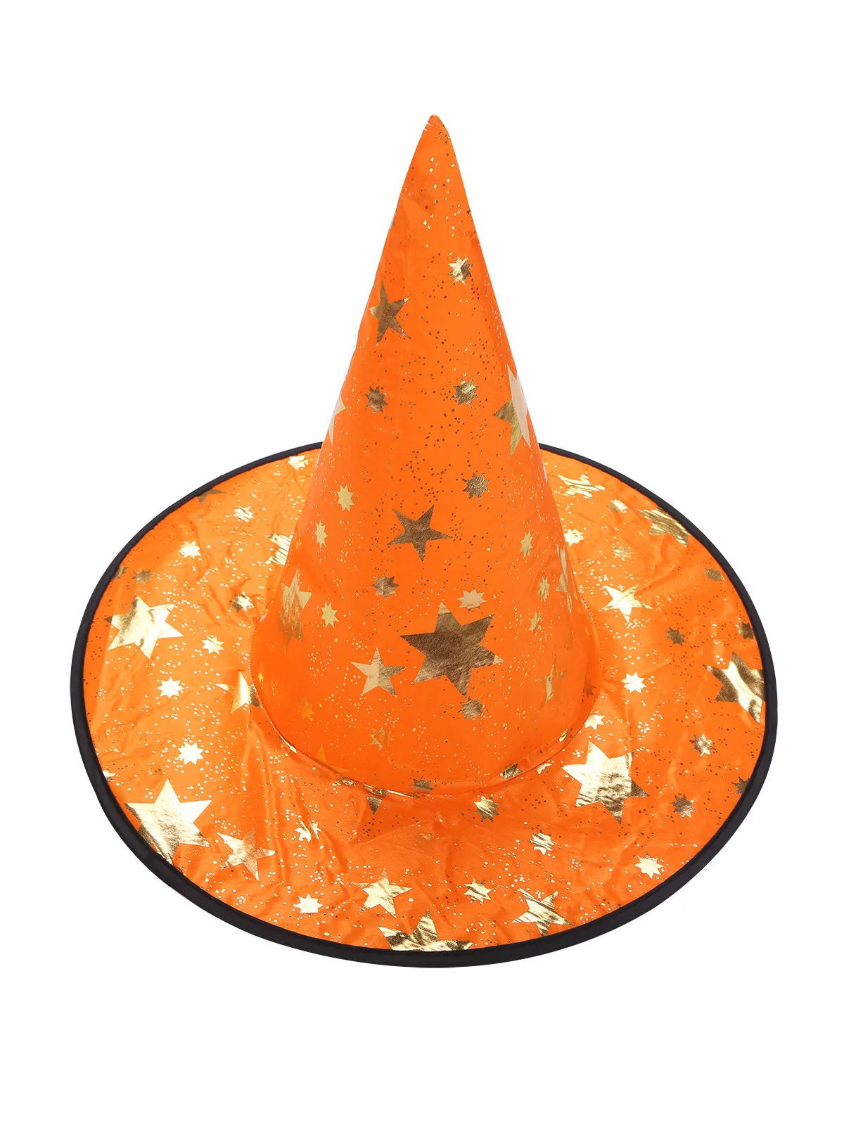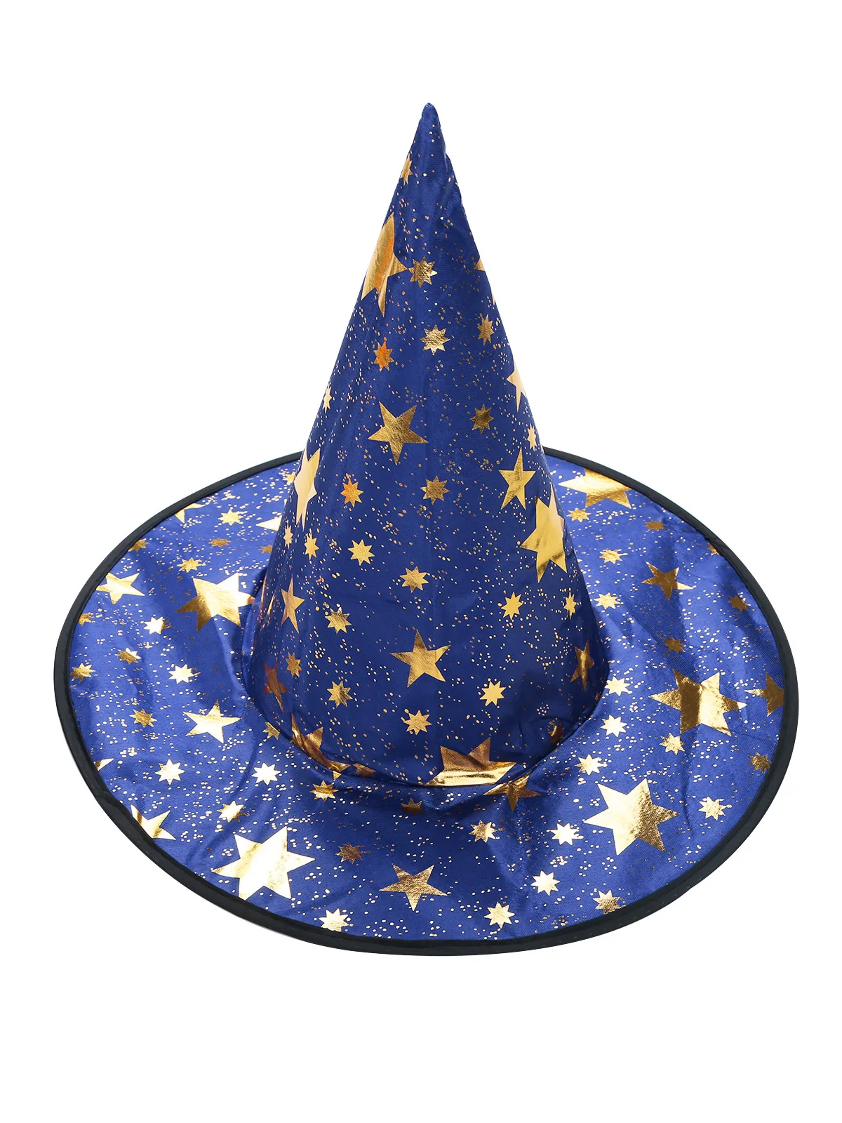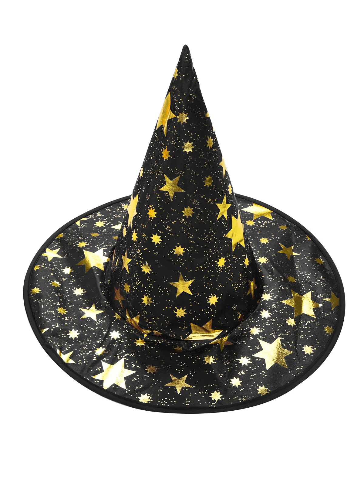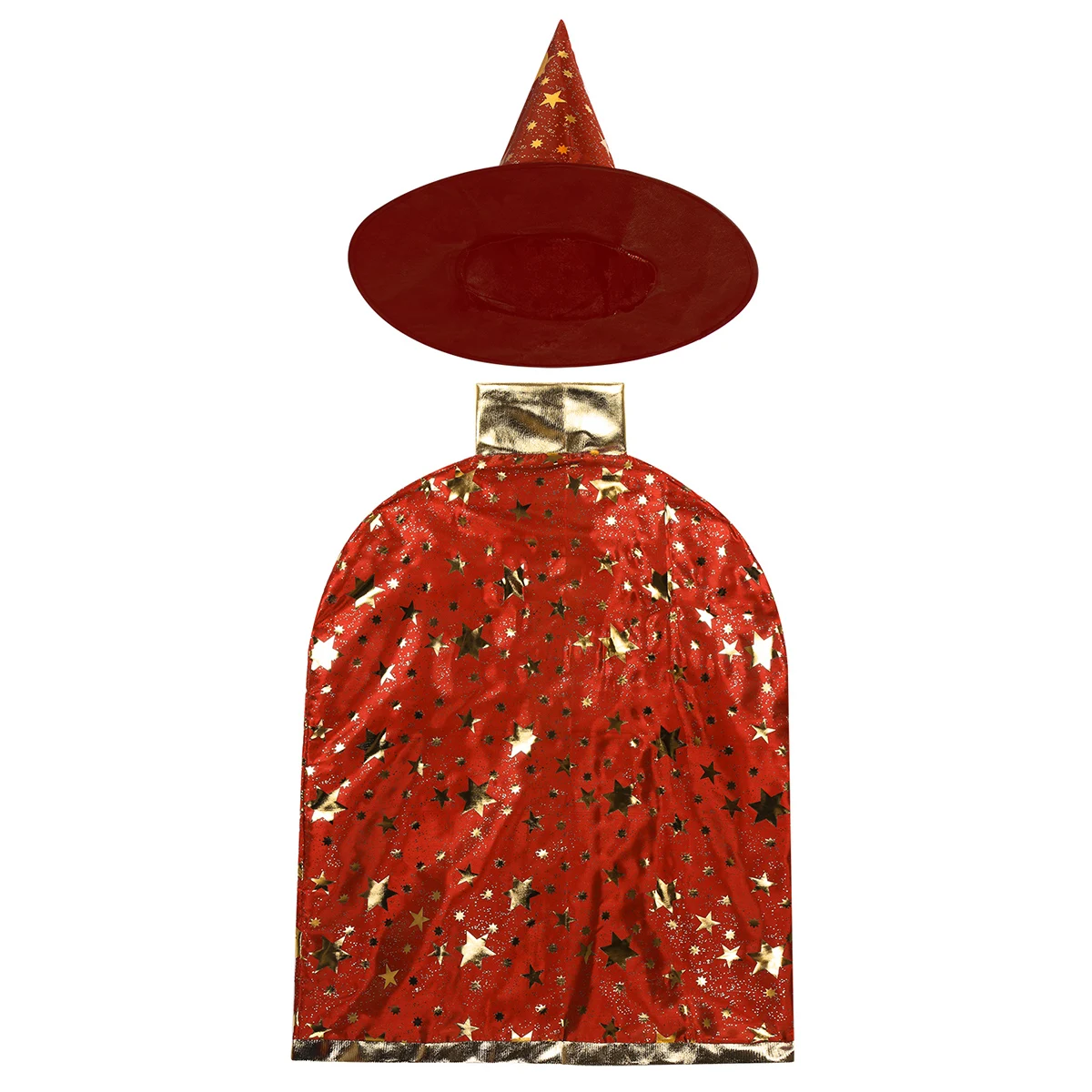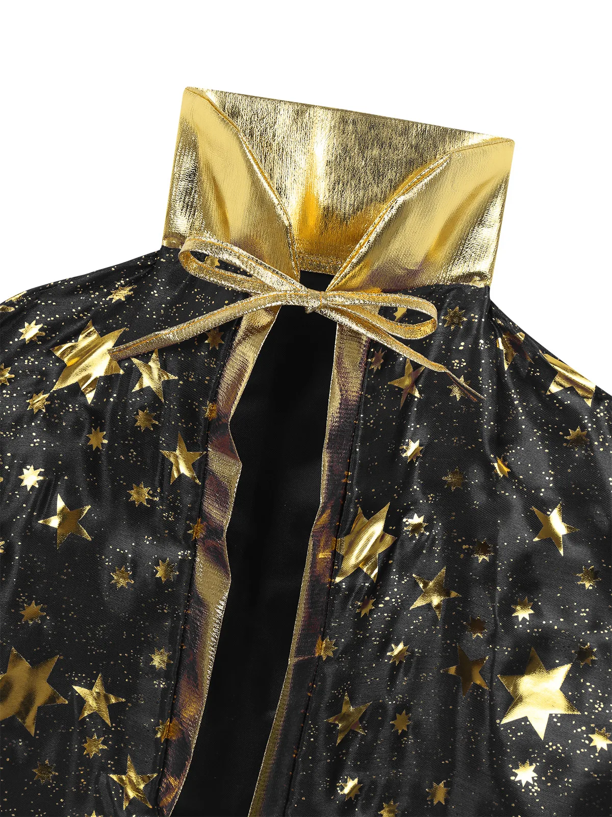 Особенности: Костюмы на Хэллоуин; Костюм для косплея; Накидка волшебника ведьмы с шапкой для детей. Изготовлен из качественного полиэстера, мягкий, удобный, приятный для кожи, не легко деформируется. Принт со звездами золотого цвета; Стиль унисекс; Один размер подходит для большинства детей. С воротником из пенопласта, который можно носить стоя или сложить вниз, с ремнями, завязывающимися под подбородком. Подходит для костюмов на Хэллоуин вечерние, ролевые игры, наряды, вампиры, маскарадные игры, выступления на сцене, фестиваль привидения, фотографии, аксессуары для костюмов и т. Д.