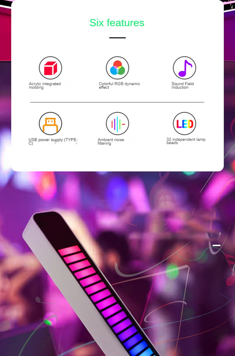 Материал: АБС + акрил + электронные компоненты Особенности:Пульт дистанционного управления APPВстроенный высокочувствительный микрофон (Голосовое управление)32 красочные лампы бусины7 режимов отображения4 уровня яркости регулируется5-уровневая регулировкой скорости18 цветовых режимов регулируетсяПоставляется с AGC автоматическим контролем усиленияЭксклюзивный интеллектуальный алгоритм деnoising, может использоваться в шумной средеПараметры продукта:Входное напряжение:> 5 в постоянного тока 1AВстроенный аккумулятор: нетВходной интерфейс: MicroUSBЧастотная характеристика: 50-16 кГцРазмеры (длина, ширина и высота): 181*16*18,5 ммОптические характеристики (длина волны):Красный: 620-625 нмЗеленый: 520-525nmСиний: 460-470нмОптические характеристики (яркость)Красный: 450-550mcdЗеленый: 1300-1500mcdСиний: 350-400mcdИнструкции:Кнопка «режим/скорость»: короткое нажатие, чтобы включить режим «Белый»-выбор режима; Длительное нажатие, чтобы включить красный-Выберите 5 скоростейЦвет/яркий ключ: короткое нажатие, чтобы включить белый-Выберите цвет; Длинное нажатие, чтобы включить зеленый-Выберите 4 уровня яркостиНажмите две кнопки одновременно: Нажмите одновременно, чтобы включить синий-чтобы узнать спектр шума окружающей средыНажмите и удерживайте цвет одновременно при включении питания: Введите режим настройки усиленияВключение питания (только для модели аккумулятора): Нажмите кнопку цвета после выключения питанияВыключение (только для модели батареи): Держите лицо вниз в течение 3 секундУпаковочный листСветильник-1 шт.1 кабель для передачи данных1 х Руководство
