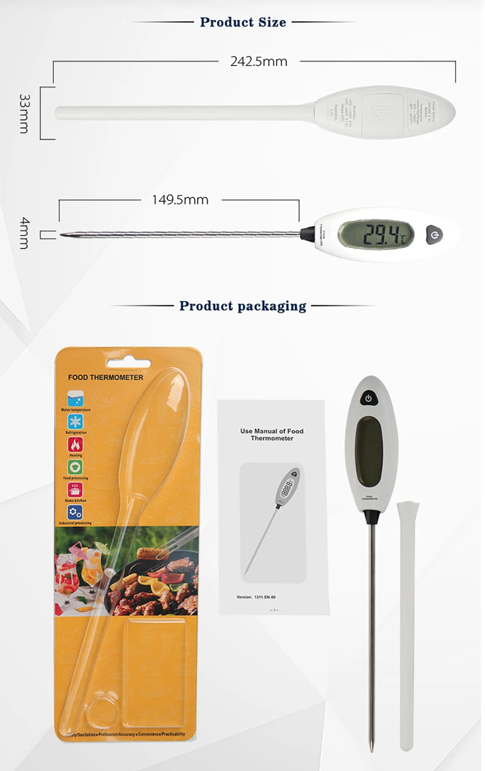 Модель: GM1311 пищевой термометр Источник питания: 1 Кнопка CR2032 диапазон измерения батареи: -50 °C ~ 300 °C (-58 °F ~ 572 °F) Разрешение: 0,1 °C/Точность: -10 - 100 °C (± 1 °C), 100 - 200 °C (± 1,5 °C), другие ± 2 °C температура окружающей среды: 0 - 40 °C (32-104 °) влажность окружающей среды: 10% - 90% RH Размер дисплея: 44x18 мм Длина нетто стержневой зонд: 149x4 мм Размер всей машины: 246x33x19 мм Вес: 35 г