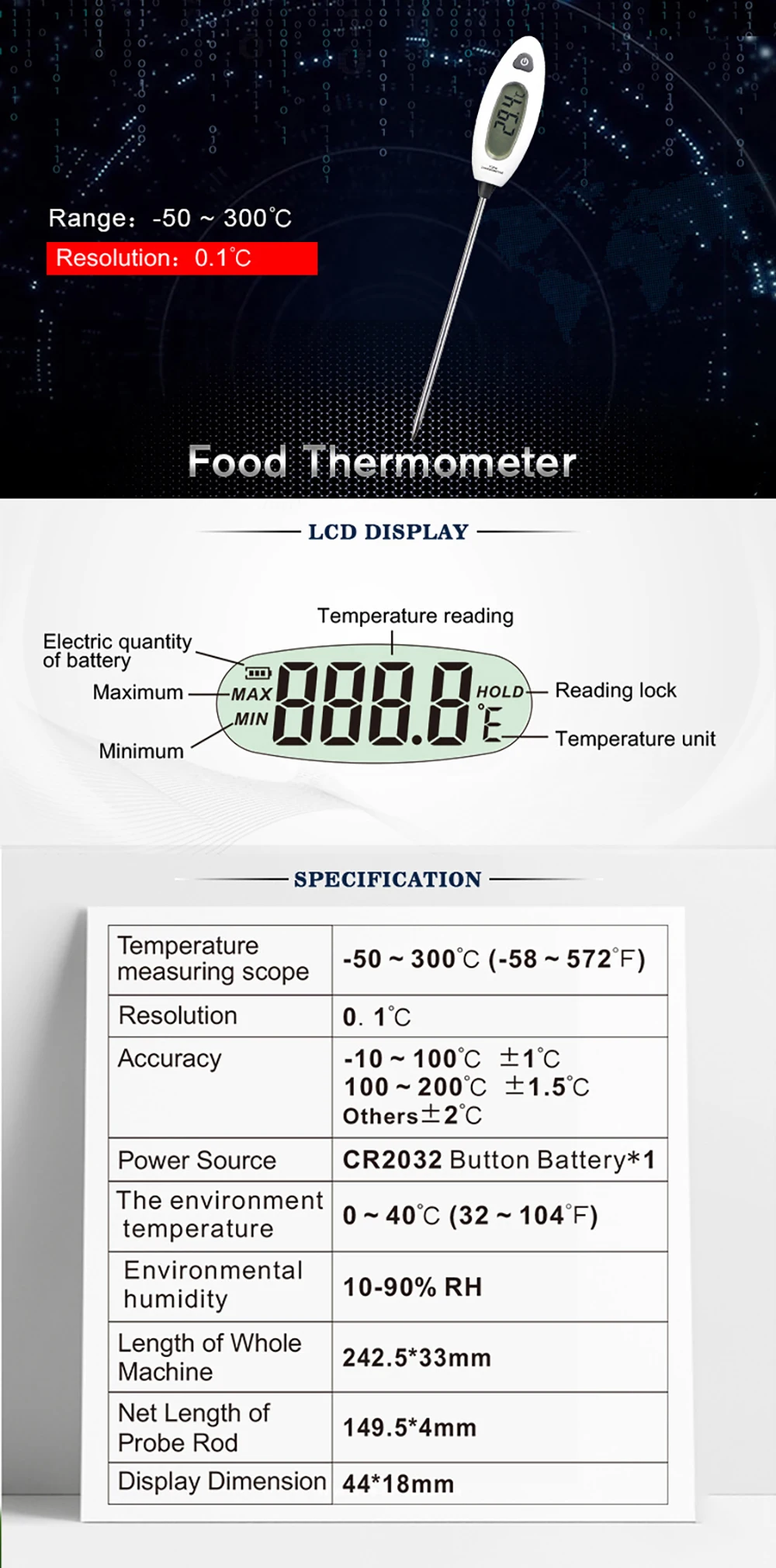 Высокое качество: из нержавеющей стали и японских импортных датчиков, которые дают длительный подъем и включают зонд с высокой точностью. Удобный дизайн: новый и портативный внешний вид; ЖК-дисплей, температурная Блокировка; Подсказка низкого энергопотребления, преобразование единиц измерения температуры °/°, а также автоматическое отключение. Широко используется: используется для измерение температуры различных полей, таких как приготовление пищи на кухне, вода, масло, конфеты, барбекю, температура мясной печи. Кроме того, он может измерять Макс/мин. Быстрый Датчик: просто нужно понизить инструмент, вы можете получить результат на дисплее в течение нескольких секунд. Широкий диапазон: допускает диапазон температур от-50 °C до 300 °C (от-58 °F до 572 °F) и Разрешение 0,1 °C/°F.