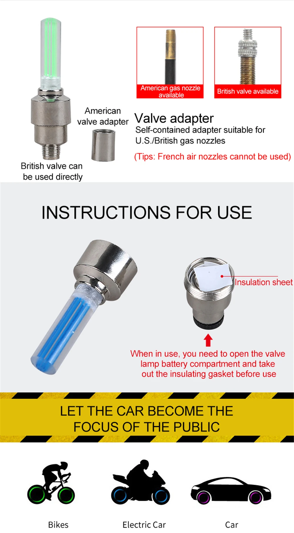 Светильник колеса велосипеда не только придает вашим автомобилям Потрясающий Красивый внешний вид, но и повышает безопасность, увеличивая видимость ночью. Он оснащен датчиками движения, светодиодный подсветкой и сменными аккумуляторами AG10. В том случае, когда это колесо вращается, клапан светильник будет светильник вверх, что делает ваш автомобиль супер красивый и привлекательный. Светильник будет выключен при остановке. Подходит для деревянных клапанов и клапанов schrader. Если клапан presta valve, вам нужно подготовить переходники для клапанов.