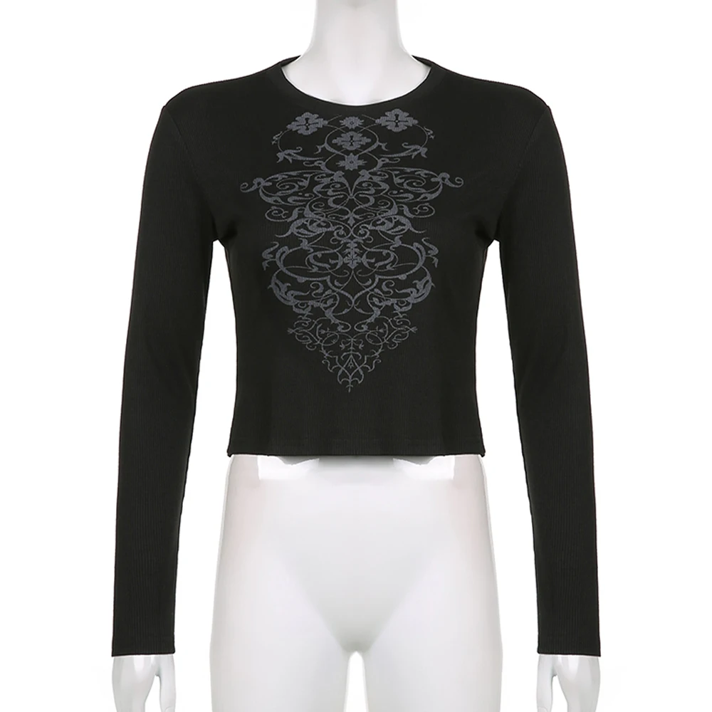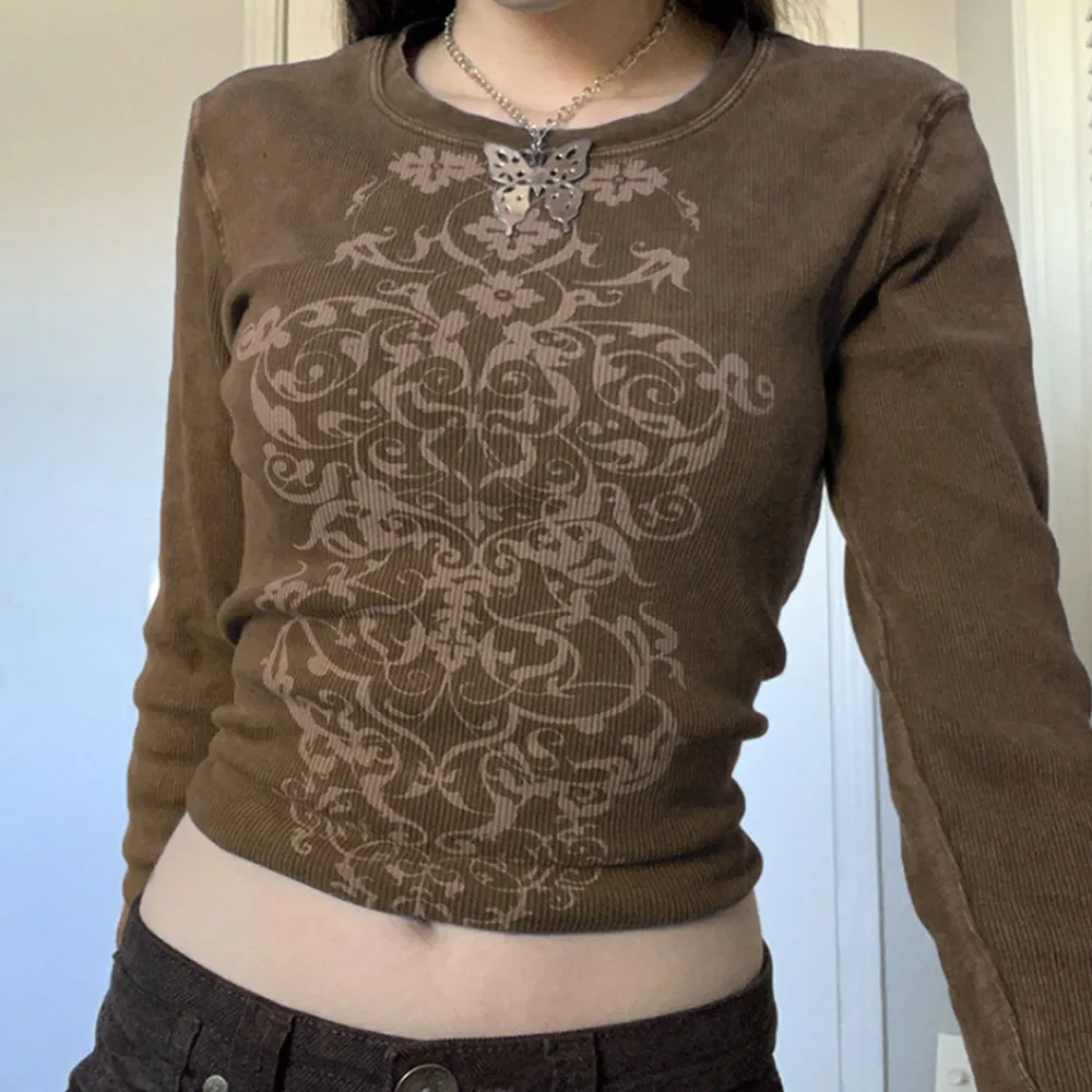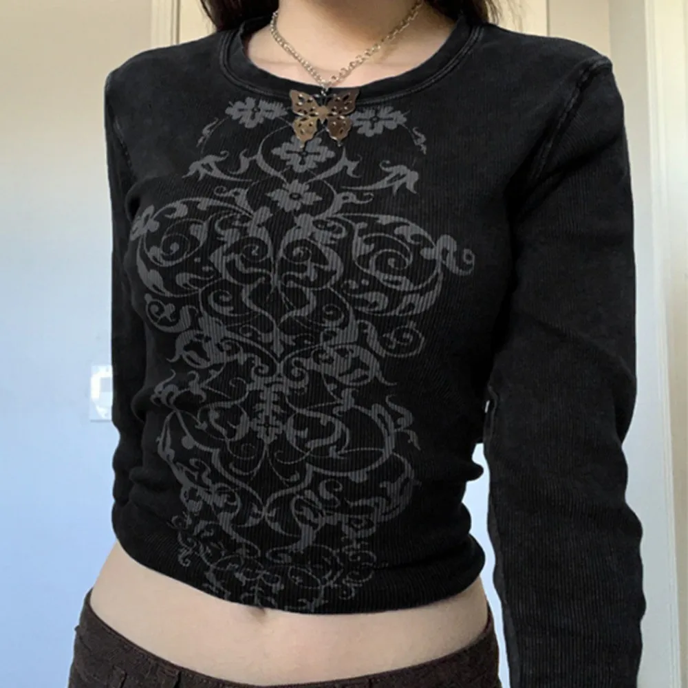 УКОРОЧЕННЫЙ ТОП Y2K, футболки с графическим принтом, тонкие Топы с длинным рукавом, футболка, повседневные пуловеры с круглым вырезом в стиле ретро, Женская Осенняя ткань в стиле Харадзюку