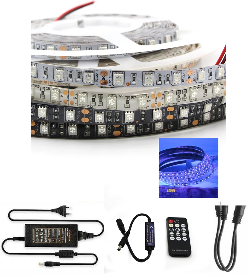 Посылка включает:1 рулон x 50 см/1 м/2 м/3 М/4 м/5 м/10 м УФ-светодиодная лента1 шт. x адаптер питания DC12V 2A/3A/6A (Европейские правила по умолчанию, нужны другие модели, пожалуйста, оставьте сообщение)1 шт. x Диммер постоянного тока1 шт. х разъем постоянного тока