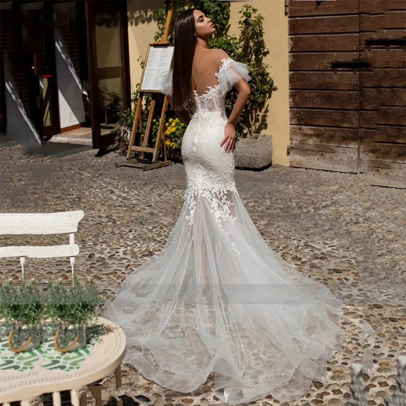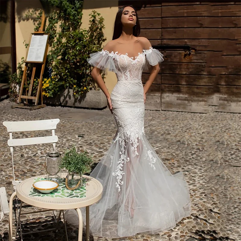HERBURNL сексуальные платья с открытыми плечами с коротким рукавом Русалка пляжные тюлевые Свадебные платья с длинным шлейфом модные платья для женщин