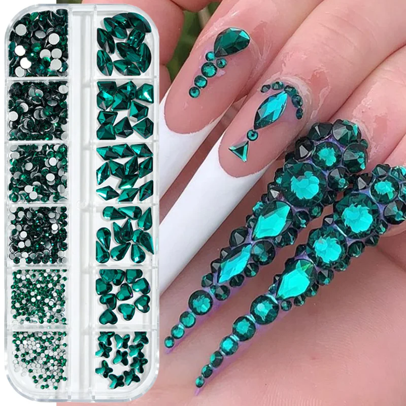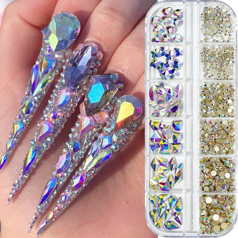 Стразы для ногтей 12 разных размеров AB с плоской задней стороной, стеклянные кристаллы, красное, зеленое золото, блестящие алмазные драгоценные камни, 3D блестящие украшения для дизайна ногтей