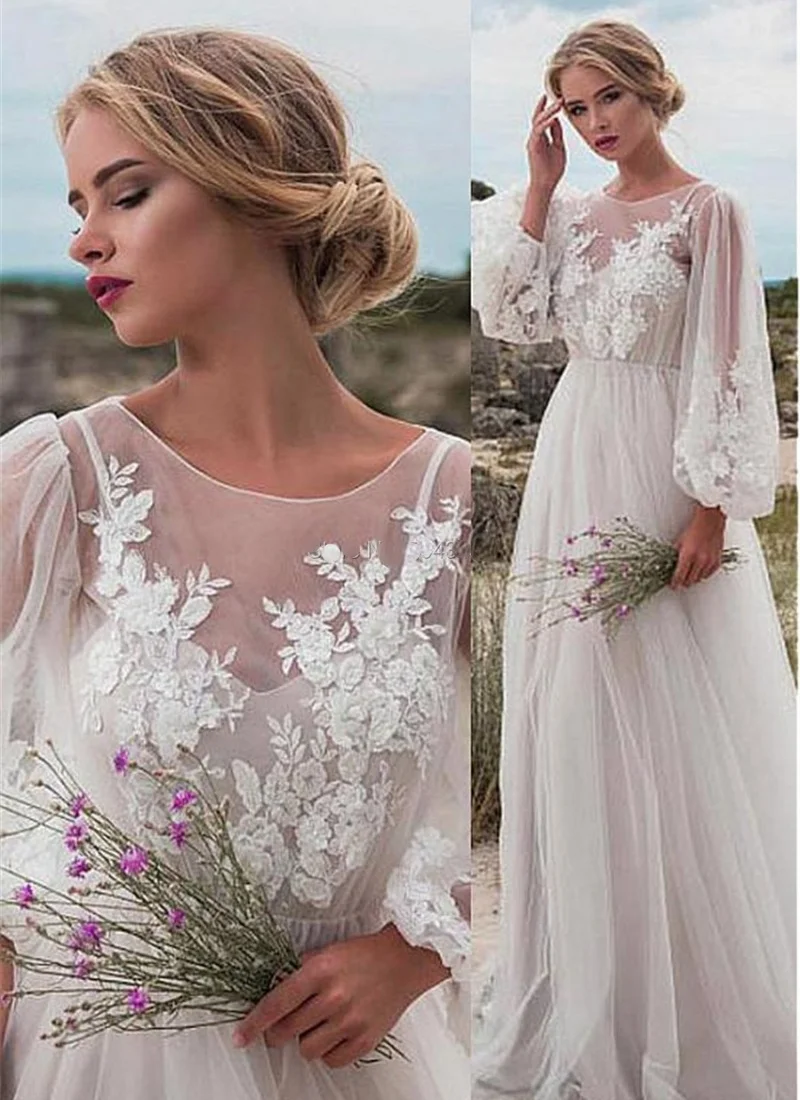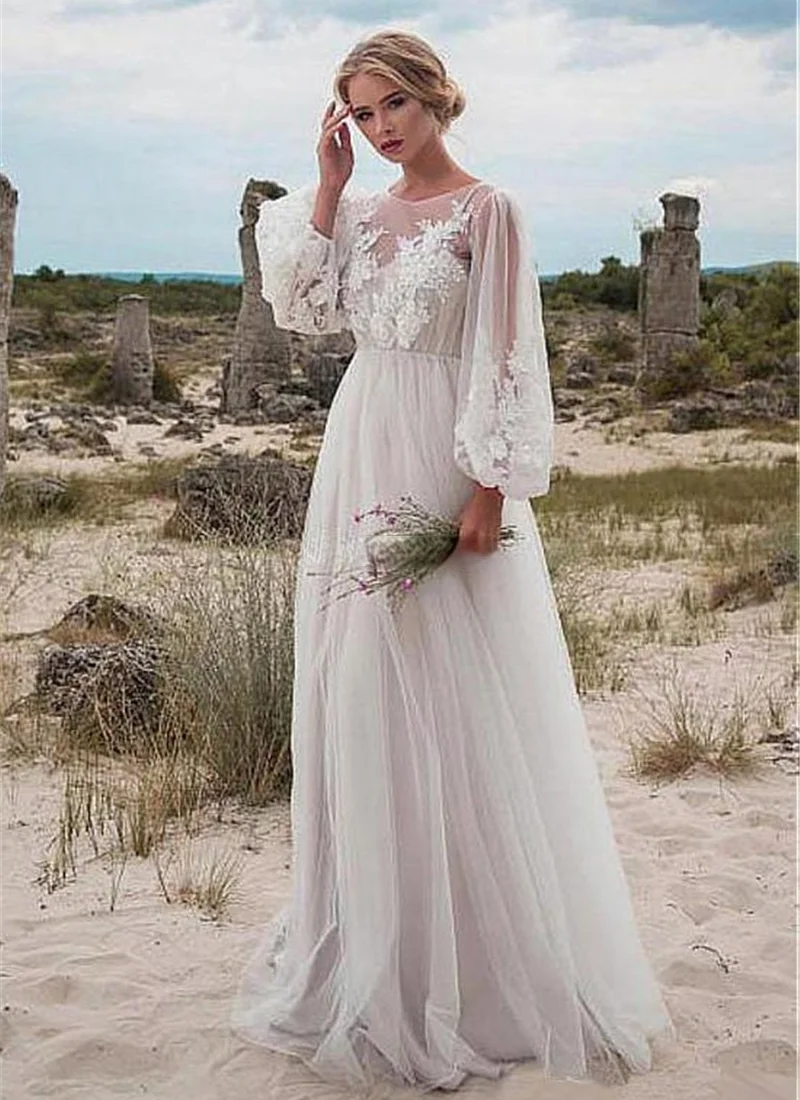 Свадебное платье с длинными рукавами, кружевной аппликацией, а-силу...