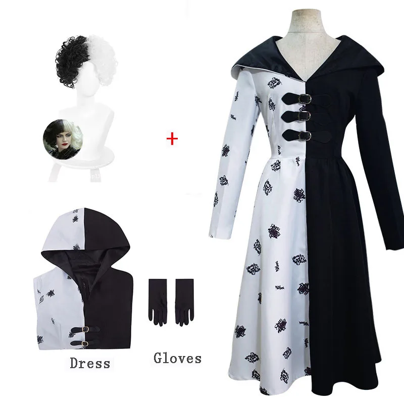 Косплей-костюм Кино злые мадам Круэлла де Виль для взрослых и женщин, черно-белое платье горничной, перчатки, юбка-худи, парик для вечевечерние на Хэллоуин