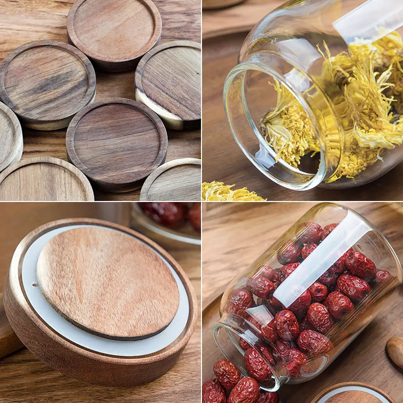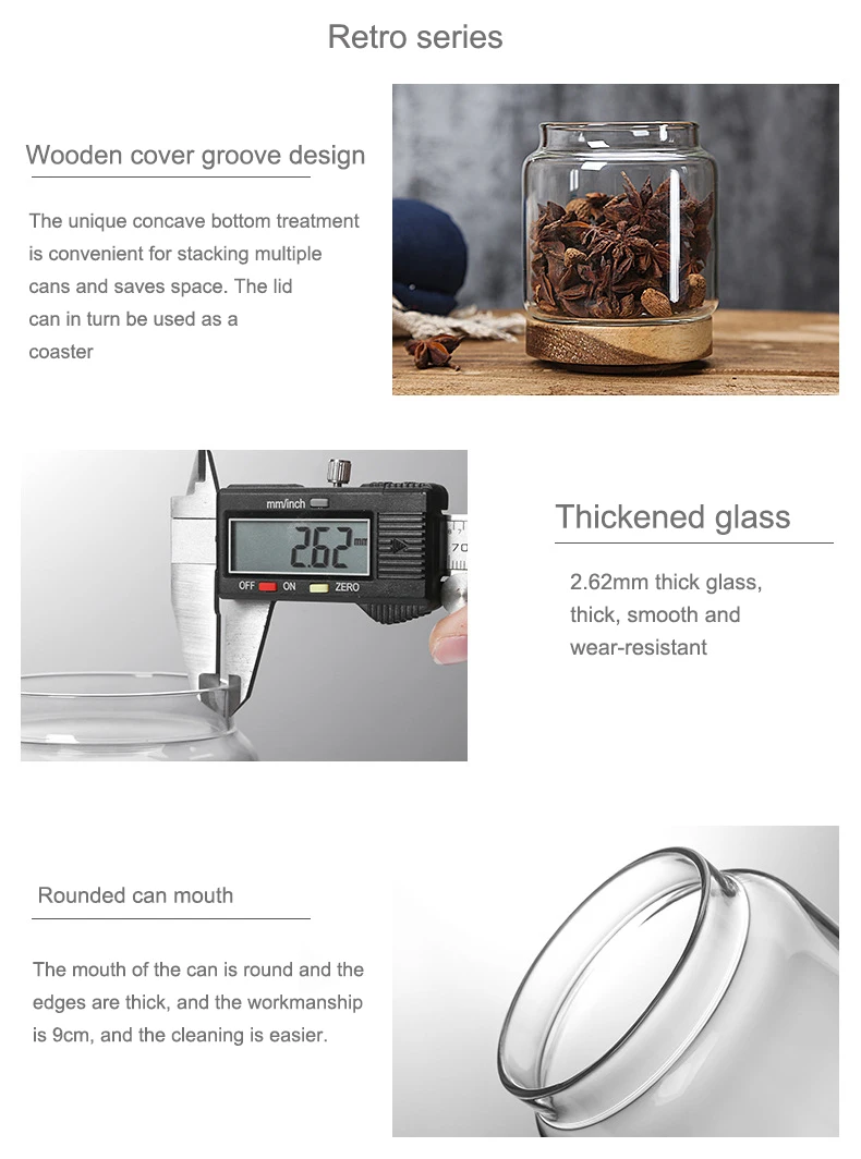 Банки для хранения изготовлены из высококачественного бессвинцового боросиликатного стекла. Сделано с высокой прочностью, хорошей воздухонепроницаемостью, холодной и жаростойкостью, стойкостью к кислотам и щелочям и превосходной коррозионной стойкостью. Они обеспечивают прозрачное полированное основание, которое идеально контрастирует с крышкой из натурального дерева.