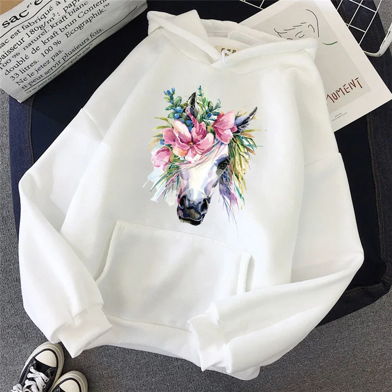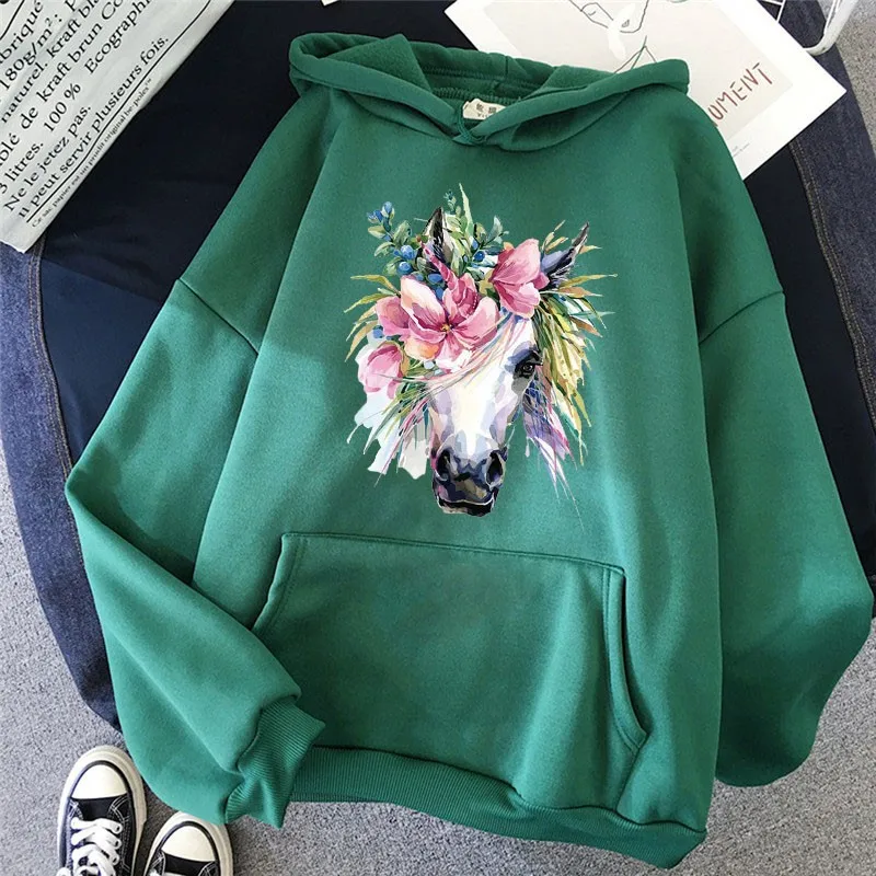 Модная женская толстовка в стиле хип-хоп с длинным рукавом и принтом лошадей и цветов, спортивная одежда, уличная одежда в Корейском стиле, свитер, женские повседневные топы
