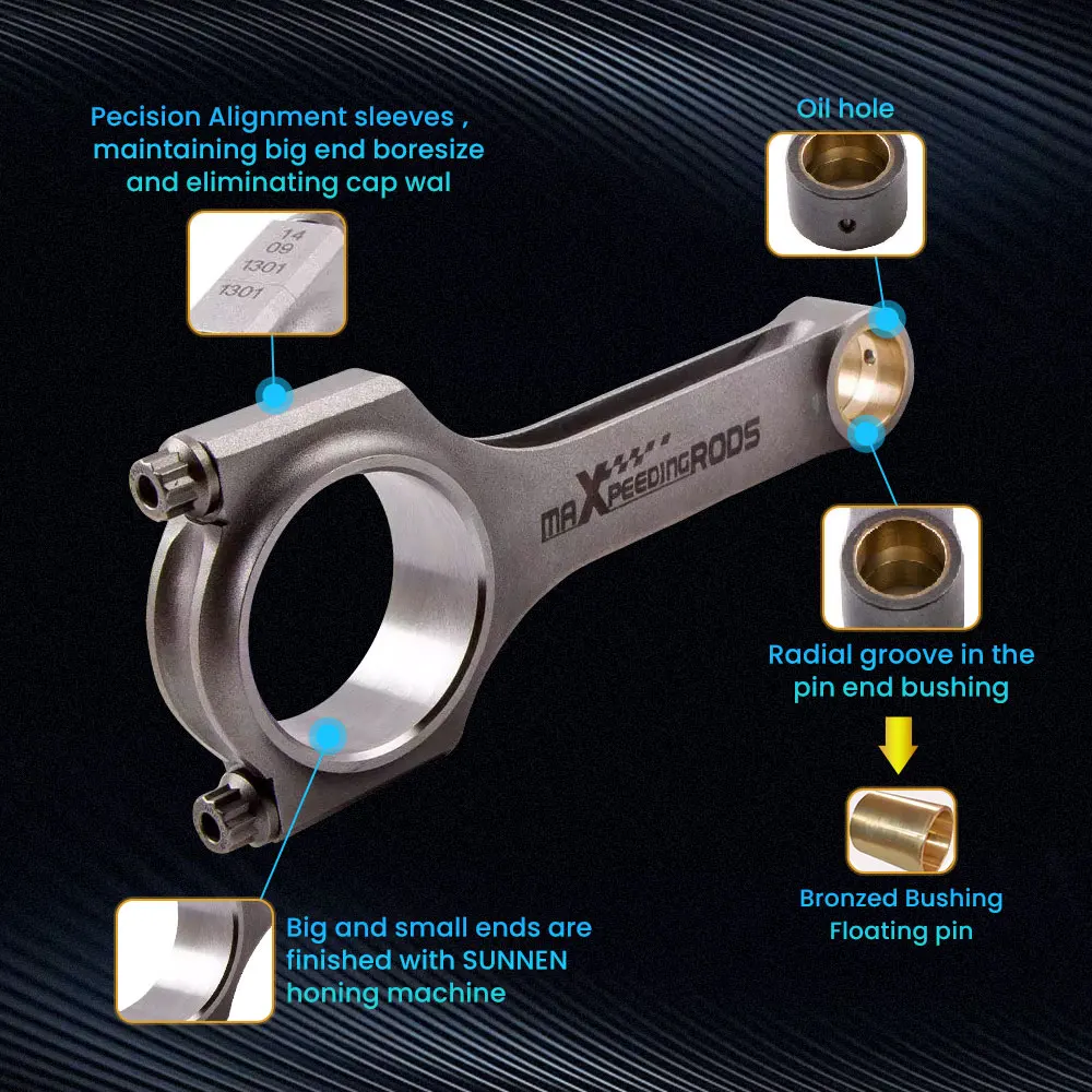 -Кованая SAE 4340 Хромовая молистая сталь для максимальной прочности и долговечности, предназначенная для гонок-Разработан и обработан станком с ЧПУ.-Все большие и маленькие концы закончены с SUNNEN хонинговальной машиной-100% X-rayed, Соник протестирован и magnafluxed-Многоступенчатая термообработка-Снятие стресса-Поставляется с Бронзовой Втулкой, подходящей для плавающего поршневого штифта