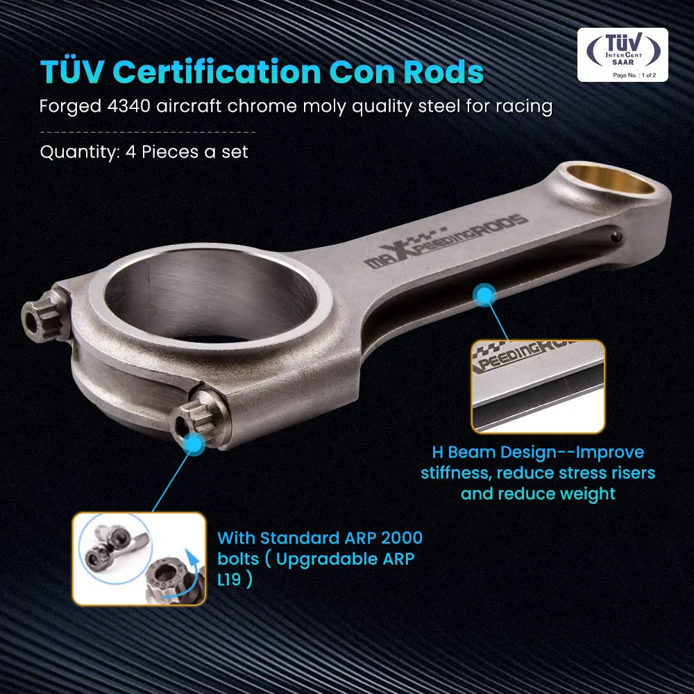 Поршень болт отверстие: +/-4/1000 ммМощность: 600hp ~ 800PS в комплектеКрутящий момент: 28 футовКоличество: 4 штуки в комплекте, как показано на картинкеБолты: включая оригинальные болты ARP 2000 5/16 "(обратите внимание на дополнительную стоимость для обновления до ARP L19 болтов)Тип: 4340 EN24 h-луч шатунДопуск по весу: сбалансированный до +/- 1 г в комплектеГарантия: 2 года гарантии.