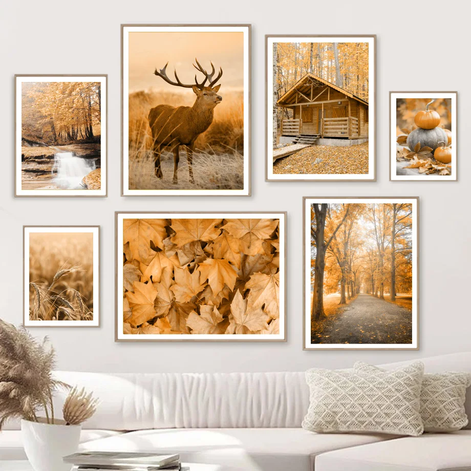 Картина на холсте, с изображением оленя, леса, Листьев, пшеницы, ручей, для гостиной