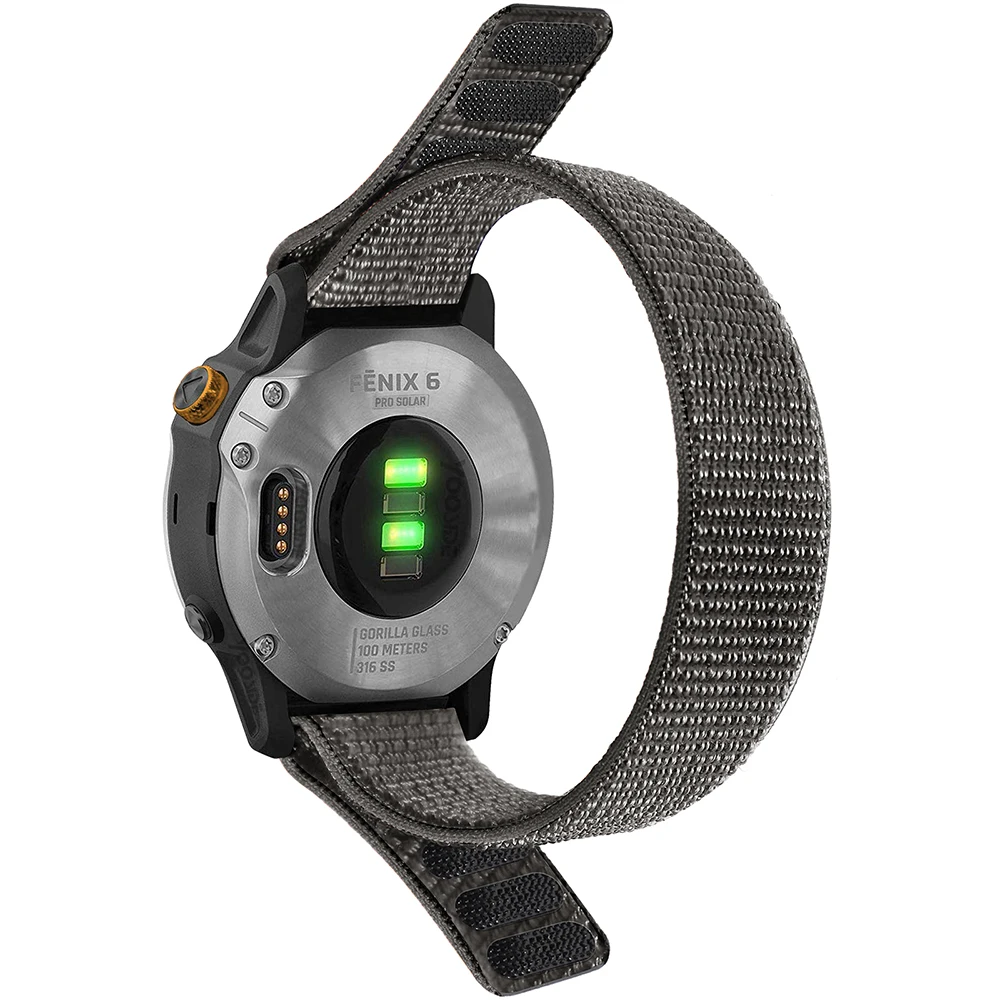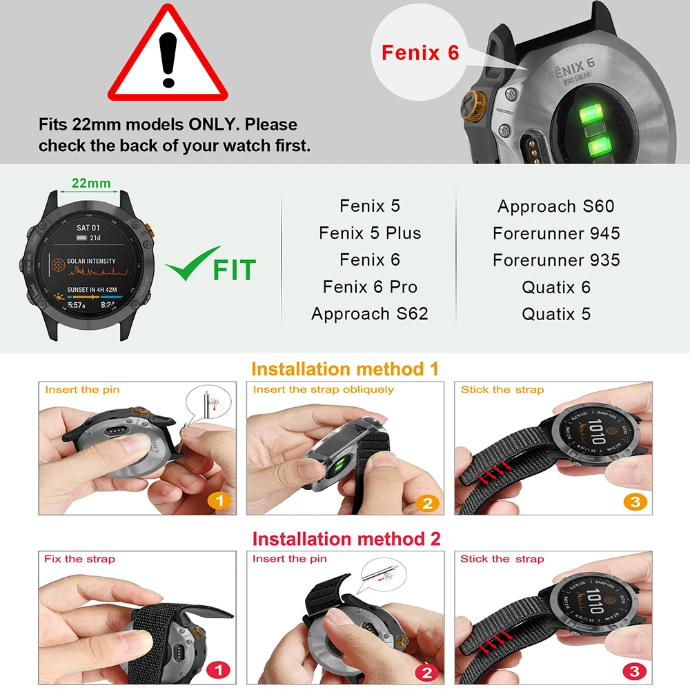Совместимые модели:22 мм ремешок для часов совместим с Garmin fenix 6 Pro/Sapphire,Fenix 5/5 Plus,Approach S60/S62,Quatix 5/Quatix 6,Instinct/Tactical Instinct, Forerunner 935/945.Только ремешок для часов, Смарт-часы не включены.> Крюк и петля дизайн, крючки аккуратно расположены, небольшой зазор и сильная ручка, более последовательный контакт кожи с более плотным, это может даже улучшить мониторинг сердечного ритма,> Цельный Объемный дизайн, легко регулировать длину ремешка, подходит для размера запястья 5,11-9,05 дюйма (130 мм-230 мм)> Инновационные нейлоновые материалы, мягкие, дышащие, жесткие и мягкие, чтобы вы не чувствовали это. Легкий и удобный в носке. Можно стирать, особенно для спорта, бега, йоги, пеших прогулок и т. Д.> Использование ремешка так же просто, удалите ваш текущий ремешок Quick Fit, вставьте в наконечники часов вашего Garmin Fenix 6/5. И, наконец, прижмите запястье.