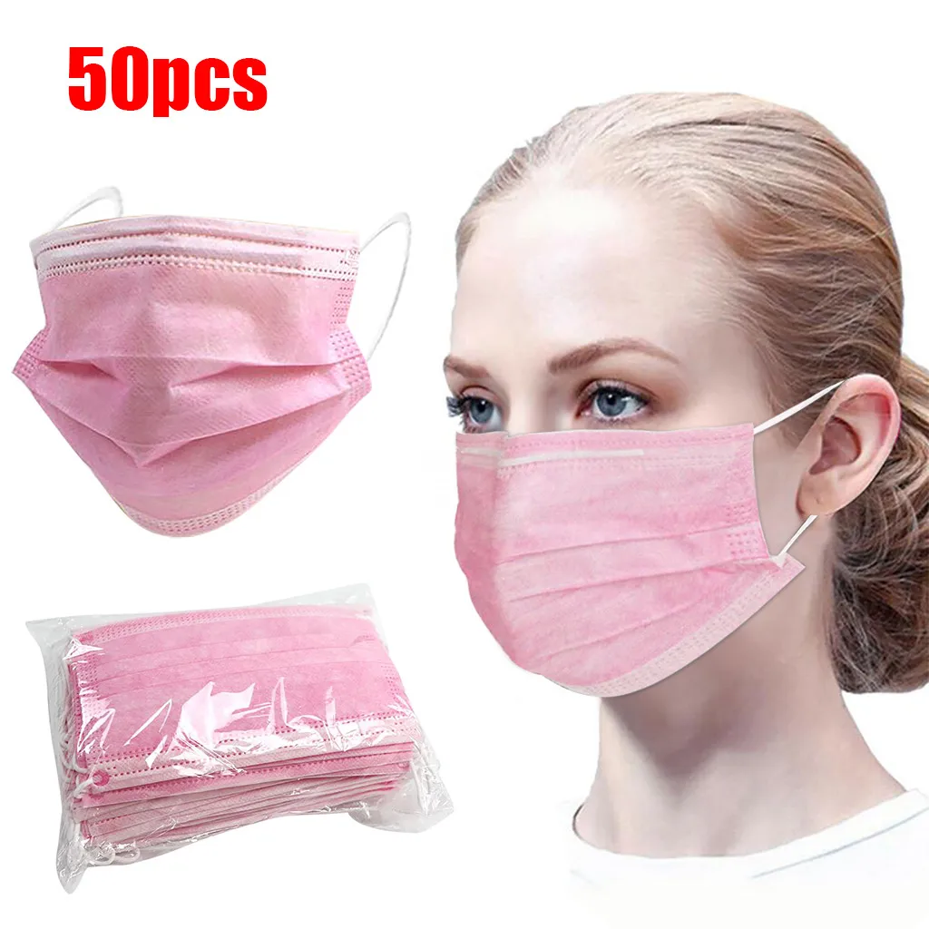 Маска одноразовая розовая для лица, с колпачками от загрязнений, 3 слоя, 50 шт.