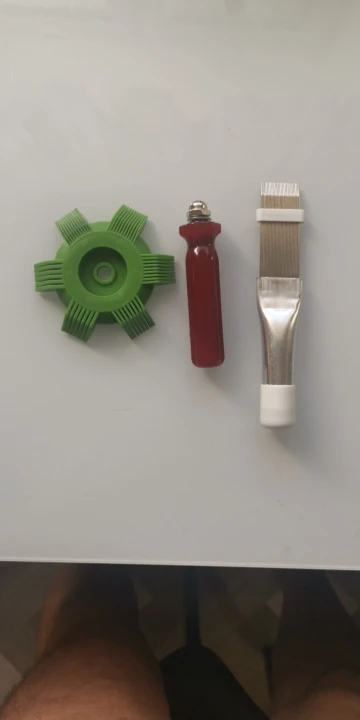 более функциональная металлическая расческа. она и универсальная. пластиковая более щадящая ею повредить пластины сложней но и работать тяжелей. мне удалось выровнять все ребра на конвекторе после того как по нему походили строители. спасибо.