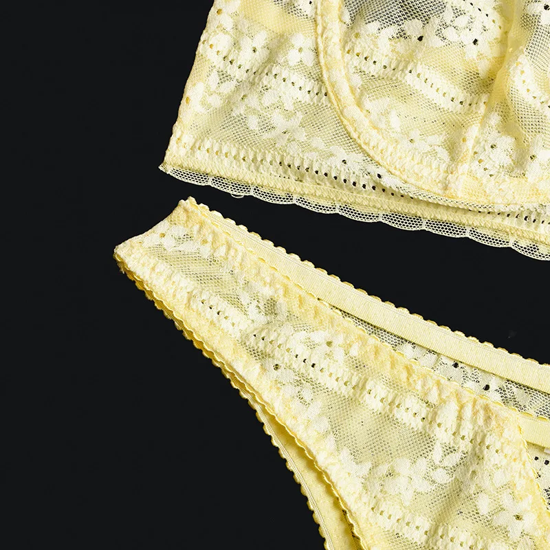 Комплект прозрачного нижнего белья желтого цвета с бюстгальтером и трусиками, женское белье кремового цвета, бесшовные привлекательные кружевные комплекты с экзотическими трусиками пуш-ап на косточках