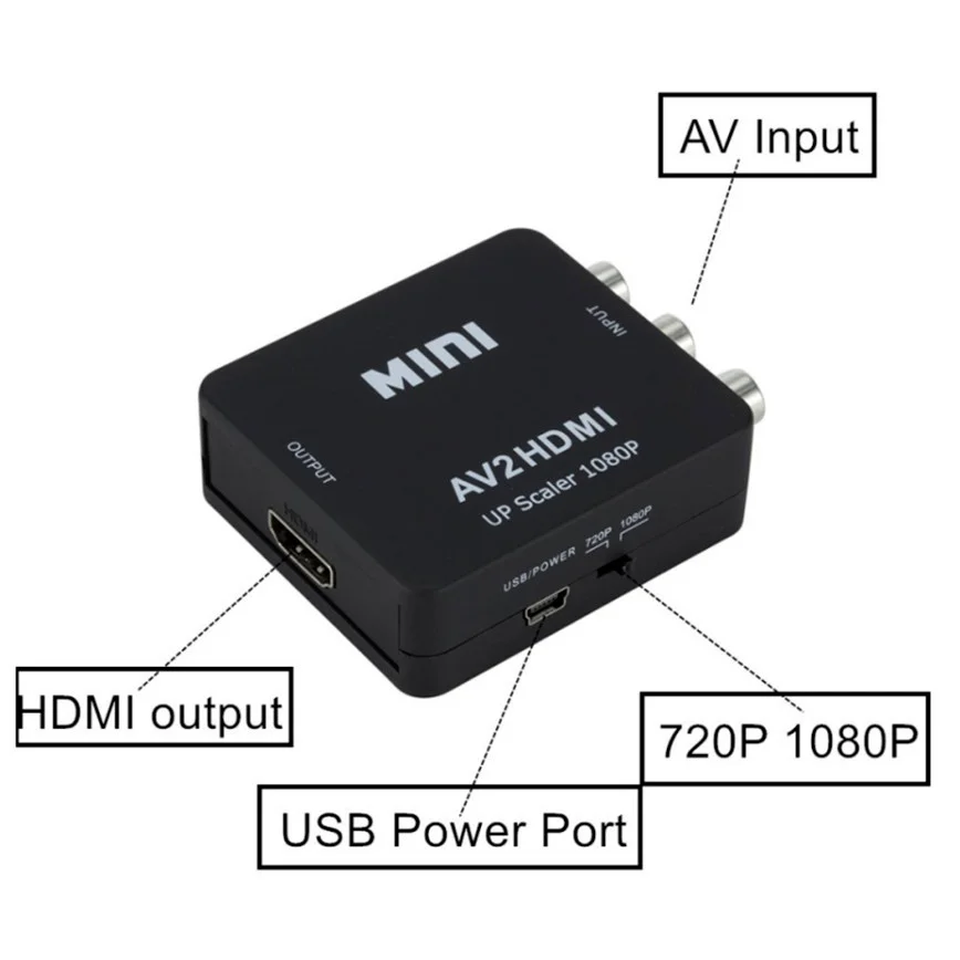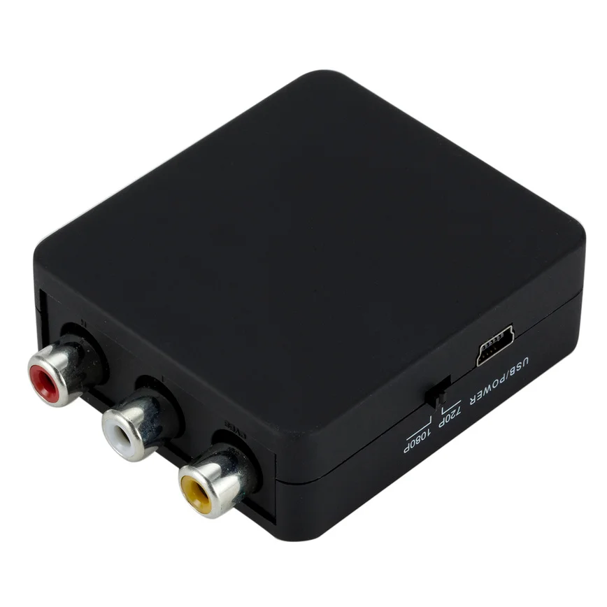 Особенности:Входные порты: 1xrca (желтый, белый, красный).Выходные порты: 1xhdmi.Размеры (мм): 66(D)x55(W)x20(H)Композитный вход: PAL,NTSC3.58,NTSC4.43,SECAM,PAL/M,PAL/N.Выход HDMI: 1080p60Hz,720p/60Hz.