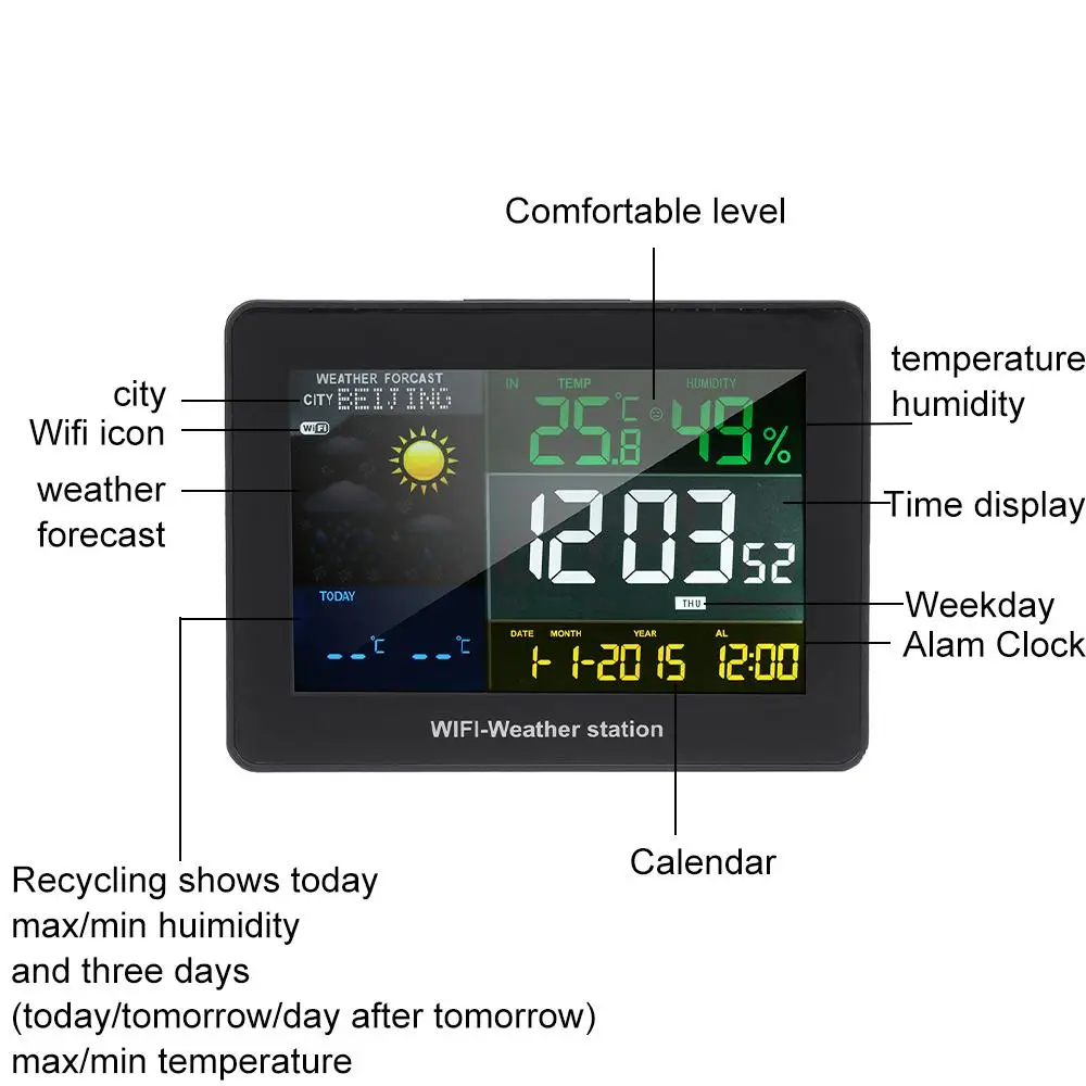 Посылка включает в себя: 1 x Погодная станция1 х беспроводной наружный датчик1 х usb-кабельРуководство пользователя на английском языке-1 шт. Характеристики: Цвет: черныйРазмер: 15.2x11.2x3.5см Основная функция: A. Функция времени: Время/минута/секундаB. 12/24 ч передача (в зависимости от времени мобильный телефон)C. Функция даты: год/месяц/дата/неделяD. Функция будильника: Настройка ежедневного будильника и рабочего дня через приложение, с функцией повтора. Е. Функция позиционирования: приложение может найти текущий город.F. Диапазон температуры в помещении:-20 ℃-50C (-4 °F ~ 122 °F)G. Диапазон влажности в помещении: 20%-95%H. Наружный диапазон температур: -40 °C-70 °C (-40 °F ~ 158 °F)I. Диапазон наружной влажности: 20%-99%J. Удаленный просмотр: приложение может проверить внутреннюю и наружную температуру и влажность (если мобильный телефон оснащен устройством раньше). Если приложение продолжает работать, вы можете удаленно просматривать кривые температуры и влажности в помещении и на улице.К. Прогноз погоды: приложение может выбрать отображение прогноза погоды в течение 1-3 дней. Максимальная и минимальная температура сегодня. Завтра и послезавтра может быть отображена. (Вы можете выбрать 1H/3H6H/12H для обновления).L. °C/°F передаваемый через приложение Примечание: 1. Допускается погрешность в 1-2 см из-за ручного измерения. Пожалуйста, убедитесь, что вы не возражаете, прежде чем сделать ставку.2. Цвета могут отличаться, так как на дисплее разница, пожалуйста, поймите.