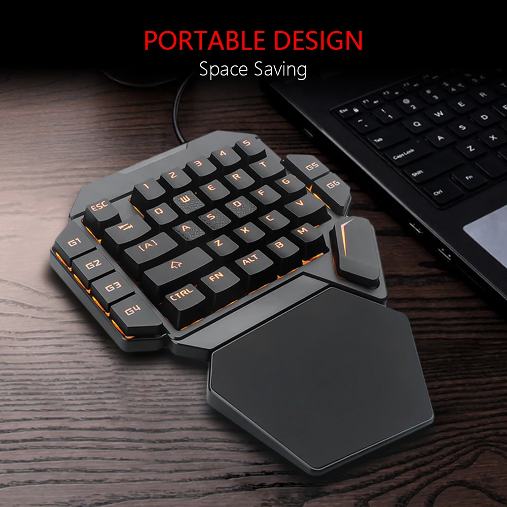 Спецификация продукта Тип клавиатуры: Механическая Тип переключателя: Синий переключатель Размер клавиатуры: 26x18,5x3,8 см Вес клавиатуры: 350 г Номер ключа: 35 Длина кабеля: 1,5 м Работает для PS4,Xbox One, ноутбука, ПК компьютерной игры. Совместимость с Win 2000,Win XP,Win ME,Win Vista,Win7,Win8,Win10,Linux. Особенности Крутой задний светильник: Встроенный 6 режимов крутой светильник, можно регулировать яркость светильник. Ключи записи: F1, F2, F3, F4 являются клавишами макрозаписи, могут быть настроены в соответствии с вашими потребностями. Эргономичный дизайн: эргономичная Поддержка одной ладони обеспечивает комфортный игровой опыт. Метод макрозаписи: 1. Нажмите FN + F1, F1 светильник вверх, введите состояние записи; 2. Введите то, что вам нужно для записи; 3. Нажмите FN + F1, чтобы завершить запись. Макрозапись завершена, нажмите F1, соответствующее содержимое будет выводиться. Метод записи F2, F3, F4 такой же, как F1. Если вы хотите очистить запись, просто нажмите FN + ESC для сброса. Метод регулировки на светильник: FN + F5: циклический переключатель 6 режимов светильник; FN + 5/6: Включите/выключите светильник.