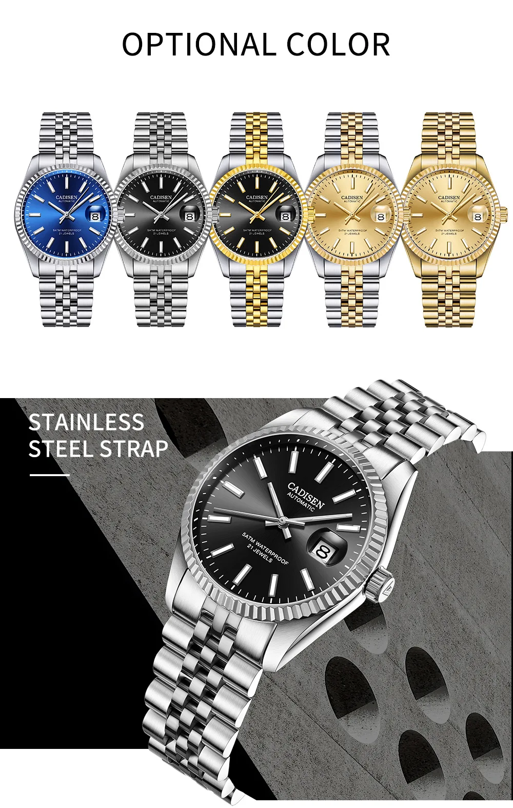 Часы мужские механические водонепроницаемые из нержавеющей стали, 5...