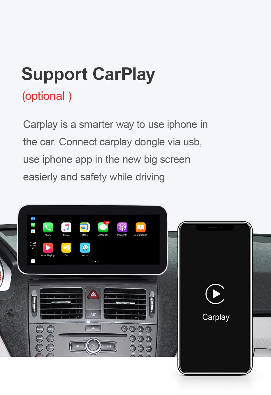 >>>support to connect carplay dongle.but you need to buy carplay dongle in your local market.carplay is smarter way to use iphone in the car.use iphone apps in the new headunit screen easierly and safety while driving. >>>if you order built in carplay option,the screen could work with carplay,do not need to buy extra accessory.