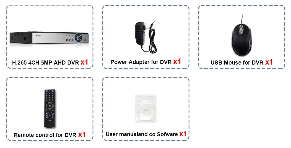 1 х H.265 4CH 5.0MP 6 в 1 AHD DVR гибридный цифровой видеорегистратор1 x Блок питания для DVR1 х USB мышь для DVR1 X CD программное обеспечение для DVR1 X пульт дистанционного управления для DVR