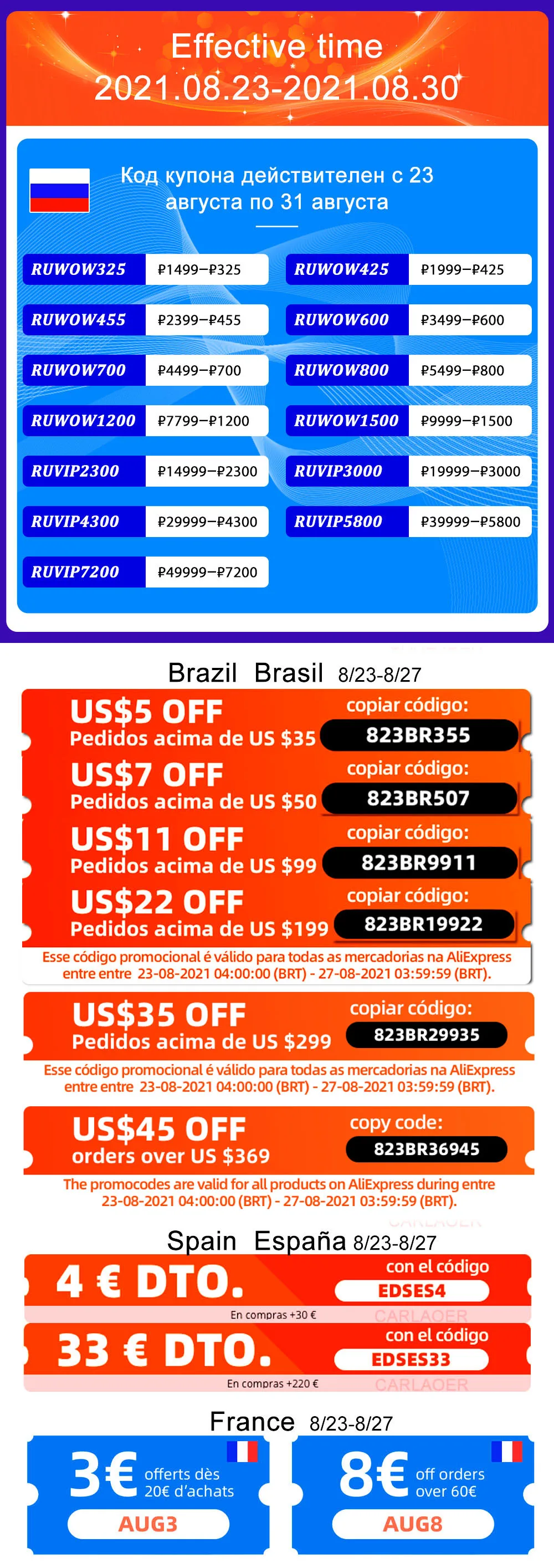 Промо-код подарка применим ко всем продуктам на Aliexxpress во время 23-08-2021 -- 27-08-2021 CARLAOER