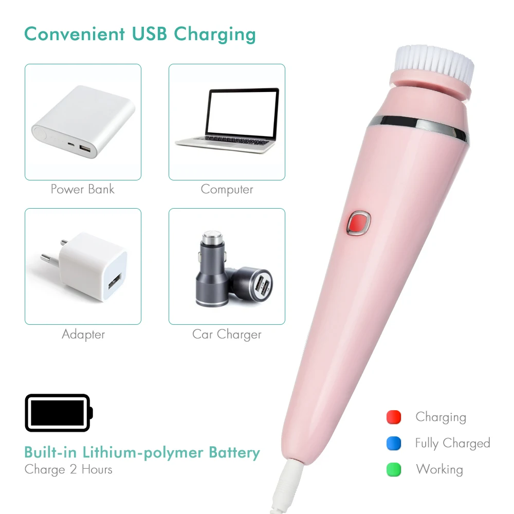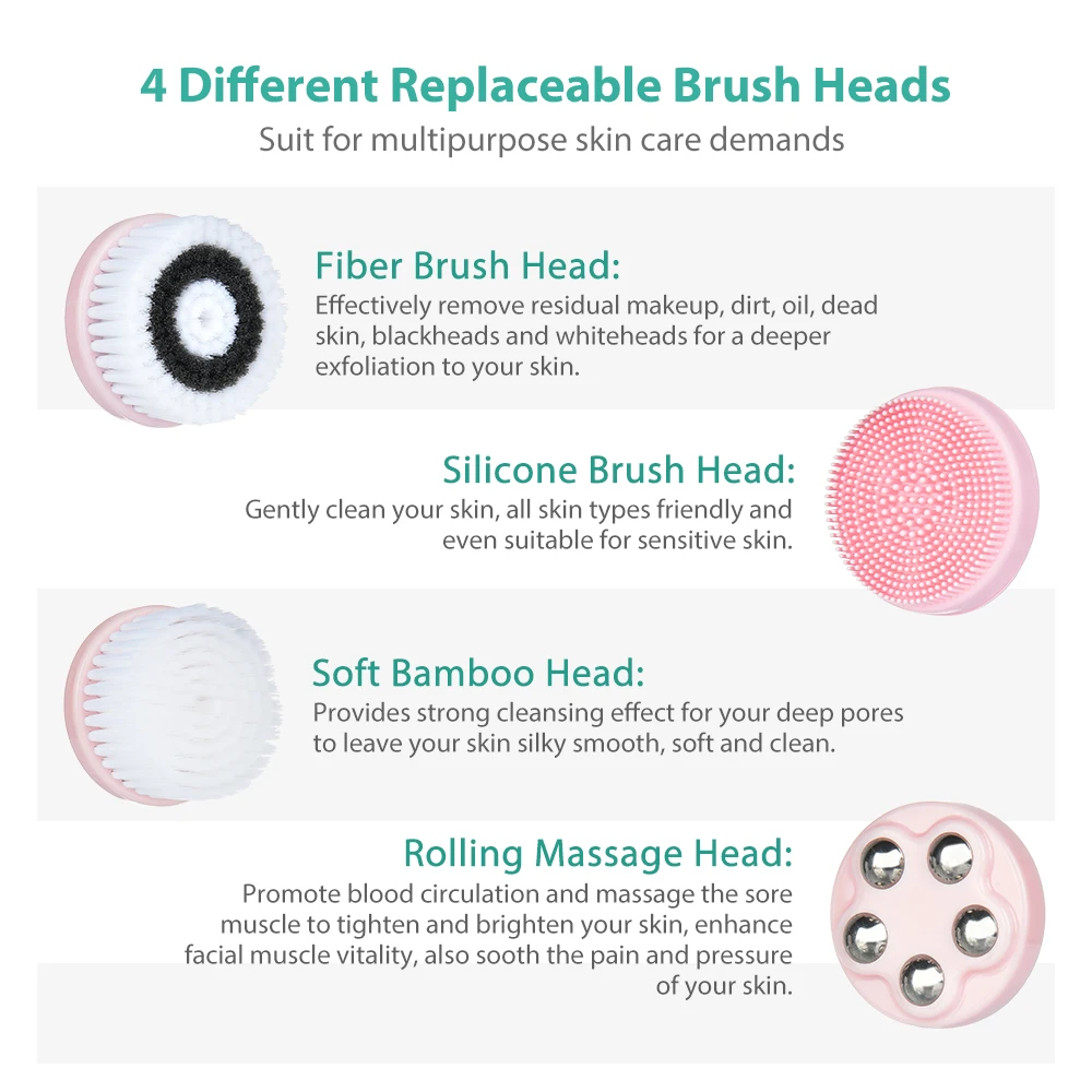 1. Многофункциональный набор для очищения лица 4-в-1 содержит 4 различных сменных головки кистей для многоцелевого ухода за кожей, не нужно покупать несколько устройств, экономично и практично.