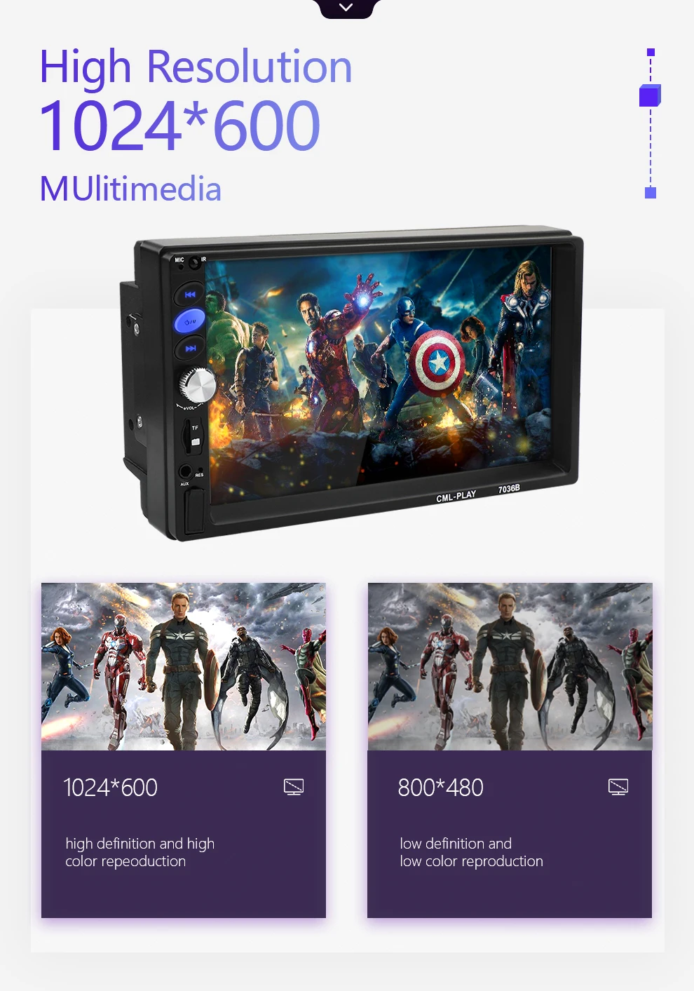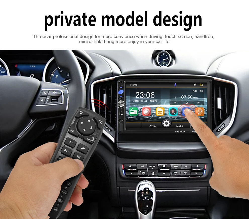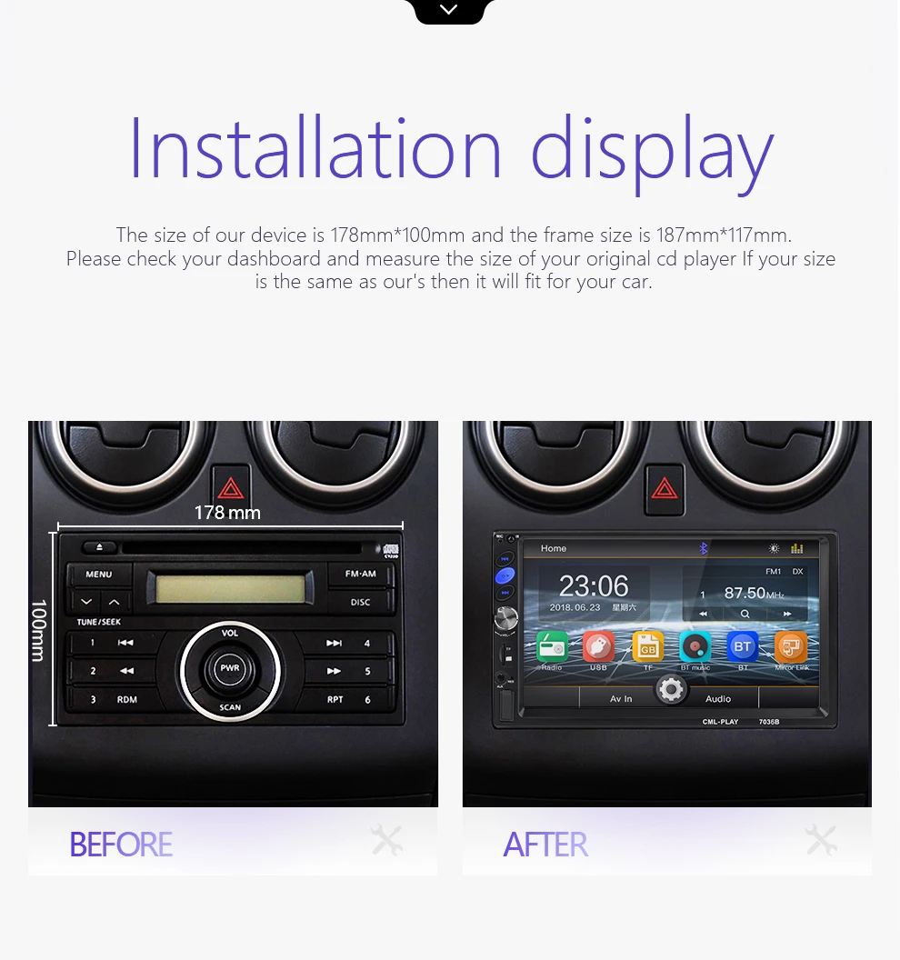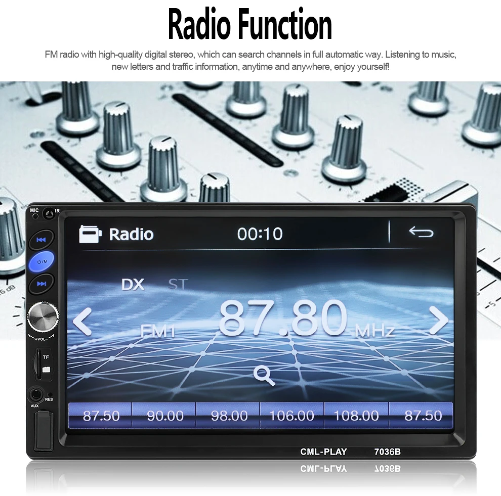 "Specifications:Type: MP5 (with camera/ no camera)Model: 7036BSystem: WINCEDecoding chip: Quanzhi C700Screen size: 7 inchesScreen resolution: 1024*600Multiple circuit protection test: overload, overvoltage, short circuitProduct size: 180 x 100 x 55 mm/7.09 x 3.94 x 2.17""Host weight: 660 gMobile phone connection: SupportGPS navigation: not supportedRadio band: FM single bandRadio chip: QN8035Languages: Simplified Chinese, English, French, German, Spanish, Portuguese, Russian, Arabic, Turkish, Thai, Hebrew, Traditional ChineseMobile phone interconnection: for Android 4.4-8.1 phonesMobile phone charging: supportReversing video input: Support (fast switching)Reverse detection method: buttcock line detectionBrake reminder function: YesSteering wheel control function: YesBluetooth: SupportAmplifier chip: TDA7388Radio frequency: 87.5M-108MFor SD card slot: support mini TF card (not included)GPS card slot: no GPS functionUSB interface: YesReset button: YesPlug type: ISO plugRCA terminal: 1 channel video output, 1 channel reversing input, 2 channel audio output, 1 channel video input, 1 channel subwoofer outputFront aux audio input: yesVolume knob: YesSupported audio formats: MP3/WMA/WAV/OGG/APE/AAC/FLACSupported video formats: RMVB/RM/FLV/3GP/MPEG/CVIX/XVID/DAT/VOB/AVISupported image formats: JPG/BMP/PNG, etc.PerformanceSignal to noise ratio: 65dBFrequency response: 20Hz-20KHzMaximum transmission function rate: 4*50WTone control: bass +/- 7dB (100Hz), treble +/- 7dB (20KHz)FM frequency range: 87.5MHz- 108MHzIncluded: