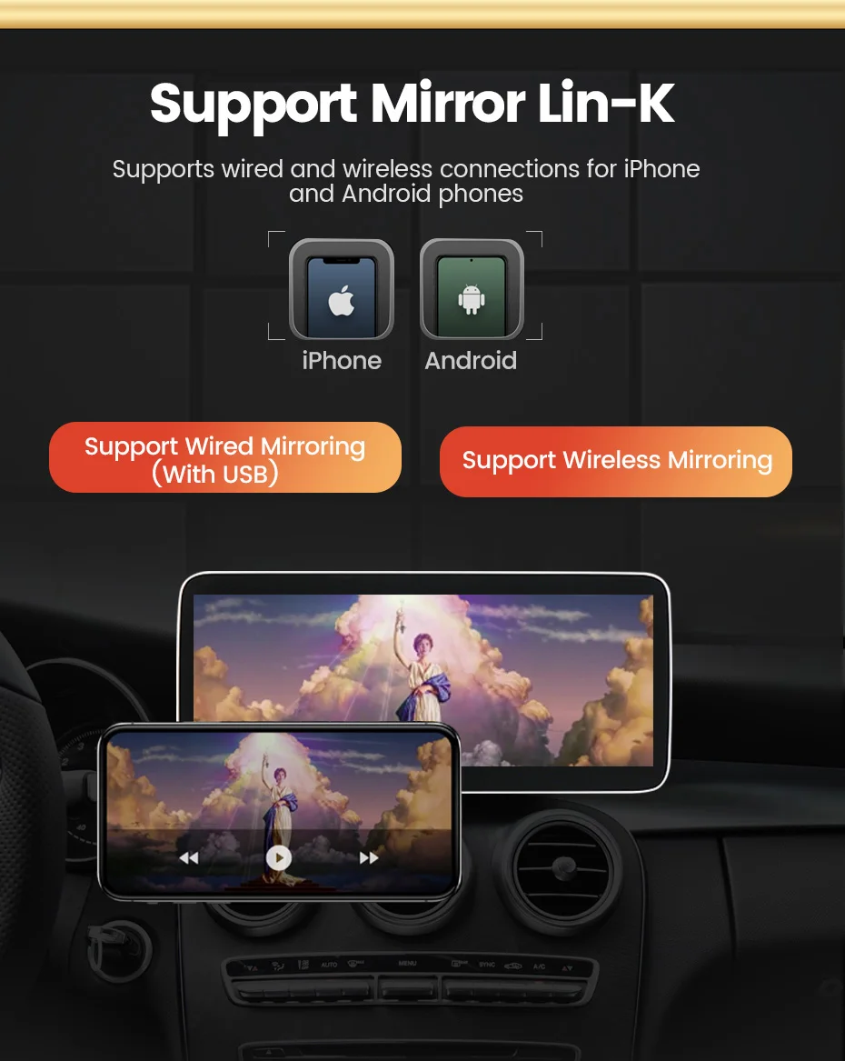 > Любой контент на смартфонах Android или IOS может быть отображен на экране машины, поэтому вы можете смотреть видео на большом дисплее. Для телефонов Android можно даже добиться двустороннего управления через USB-кабель для доступа к телефонным книгам, картам, музыке и многому другому. Ios подключается к carplay, используйте siri для голосового управления! Составьте маршрут! Удобно и быстро, представьте себе умную жизнь!