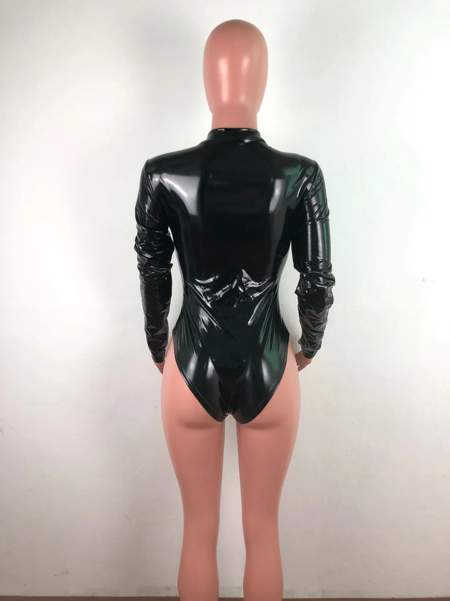 Боди из искусственной кожи с длинным рукавом, женский комбинезон, цельный клубный костюм, облегающий боди на молнии, сексуальный женский комбинезон с запахом