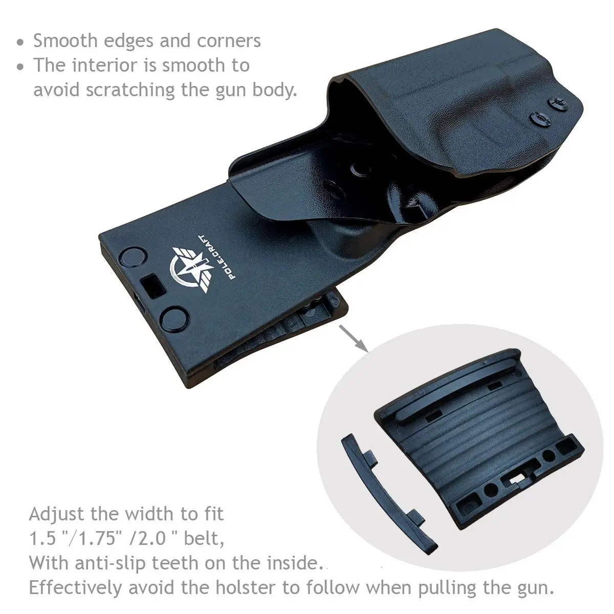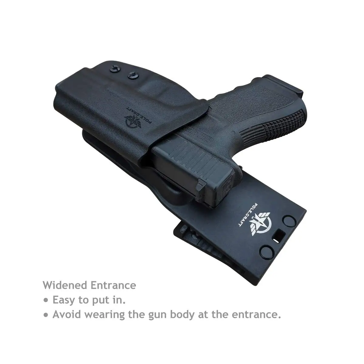 PoLe.Craft Kydex кобура имеет звуковую систему блокировки Posi-Click, и пистолет имеет четкий звук «клик», когда он вставлен, так что вы знаете, что ваш пистолет плотно сидит. Отрегулируйте винт для достижения регулировки герметичности, чтобы достичь лучшей прочности извлечения и стремиться к самому быстрому времени хранения.
