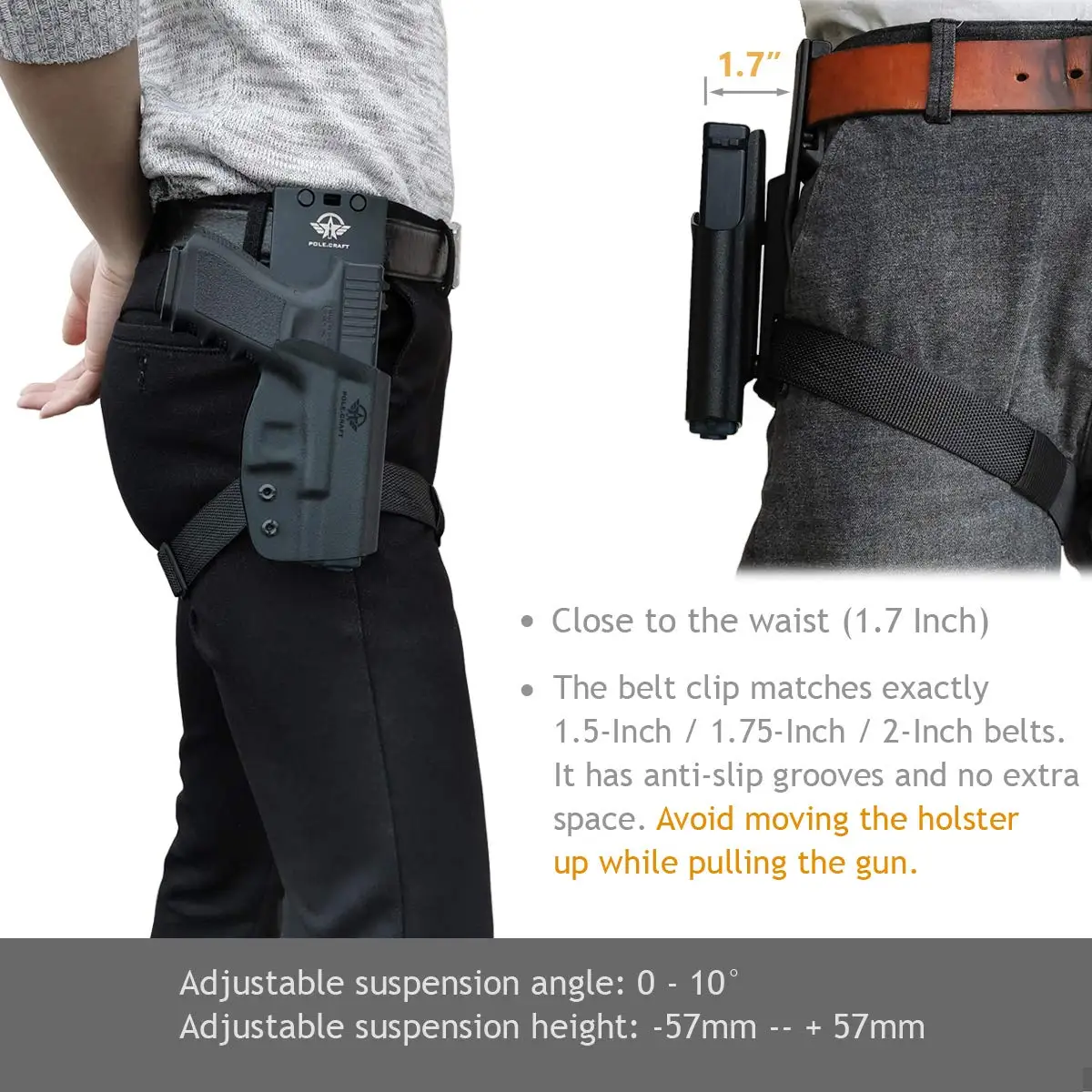 Кобуру можно носить и снимать без разборки ремня, удобно и легко использовать. Зажим для ремня точно соответствует 1,5 "/1,75" / 2 "ремень. Он имеет нескользящий паз внутри и без дополнительного пространства. Это может эффективно предотвратить кобуру от движения вверх при потянув пистолет, положение для дальнейшего повышения стабильности. Высота и угол кобуры можно регулировать по мере необходимости, чтобы получить наилучшие привычки использования. Задняя часть ремня изогнута, чтобы соответствовать талии для оптимального комфорта.