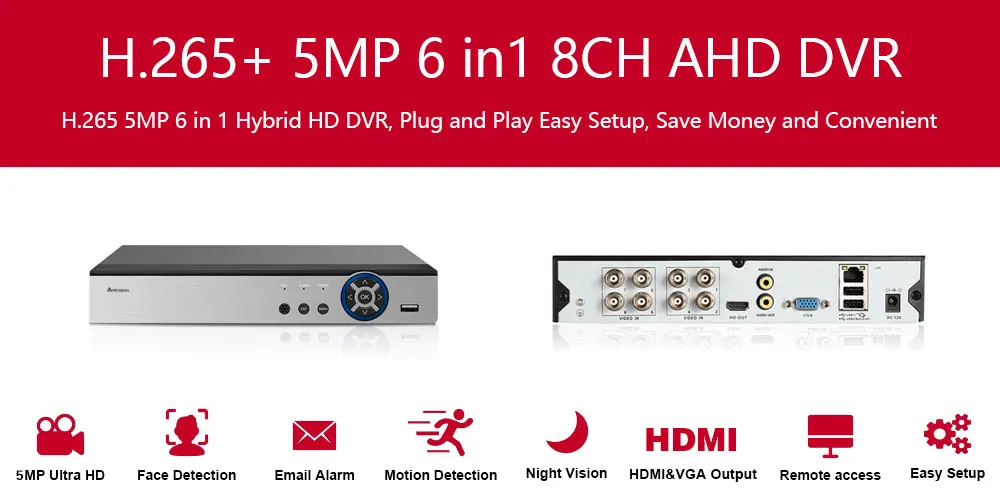 1.H.265 8-канальный AHD цифровой видеорегистратор;2, дисплей высокой четкости Ultra HD 5 МП, расширенное Сжатие видео H.265;3. Поддержка CVBS,AHD,TVI,CVI ,XVI,IP ,6 в 1 Гибридный вход;4. Поддержка распознавания лиц, записи лиц, воспроизведения лиц;5. Поддержка выхода HDMI и VGA, аудиовхода и аудиовыхода;6. Поддержка дневного ночного видения Ultra HD;7. Поддержка жесткого диска 3,5 дюйма;8. Поддержка обнаружения движения, оповещения по электронной почте, воспроизведения видео, нескольких языков;9. Поддержка Android,Iphone,Ipad, ПК, VMS,P2P view;10. Поддержка Plug and Play, простая настройка;11. Удаленный доступ в любом месте и в любое время;