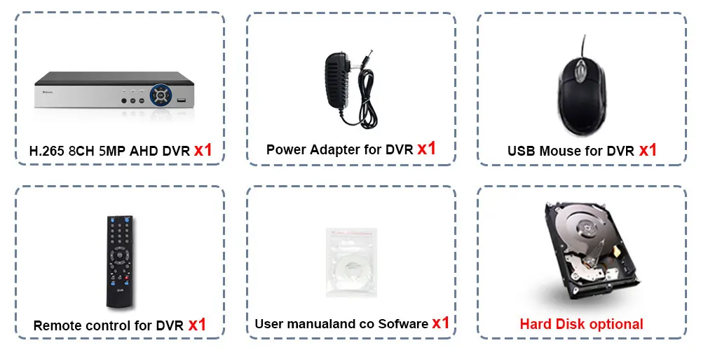 1 X H.265 8CH 5.0MP 6 в 1 AHD DVR гибридный цифровой видеорегистратор1 блок питания для DVR1 USB-мышь для DVR1 компакт-диск с программным обеспечением для DVR1 х пульт дистанционного управления для DVR