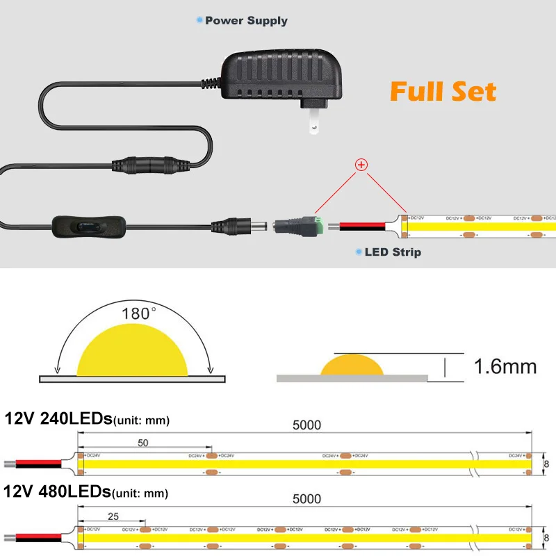Спецификация:Мощность Вход: 100 ~ 240V 50/60HzВыходная мощность: 240 светодиодов/m-12V2A, 480 светодиодов/m-12V3A.Ширина печатной платы: 240 светодиодов/m-8mm, 480 светодиодов/m-8mm.Количество СВЕТОДИОДНЫЙ: 240 светодиодный s/m, 480 светодиодный s/m.Длина резки: каждые 50 мм (240 светодиодов/м), каждые 25 мм (480 светодиодов/м).Цветовая температура: теплый белый (2700K), теплый белый (3000K), натуральный белый (4000K), холодный белый (6000K).Индекс цветопередачи: Ra>90.Рабочая температура: -20 ℃-+ 45 ℃.Температура хранения: -20 ℃-+ 60 ℃.Угол обзора: 180 °.Посылка:1 × 5 м COB светодиодный ленточный светильник.1 × кнопочный переключатель1 × блок питания DC12V.