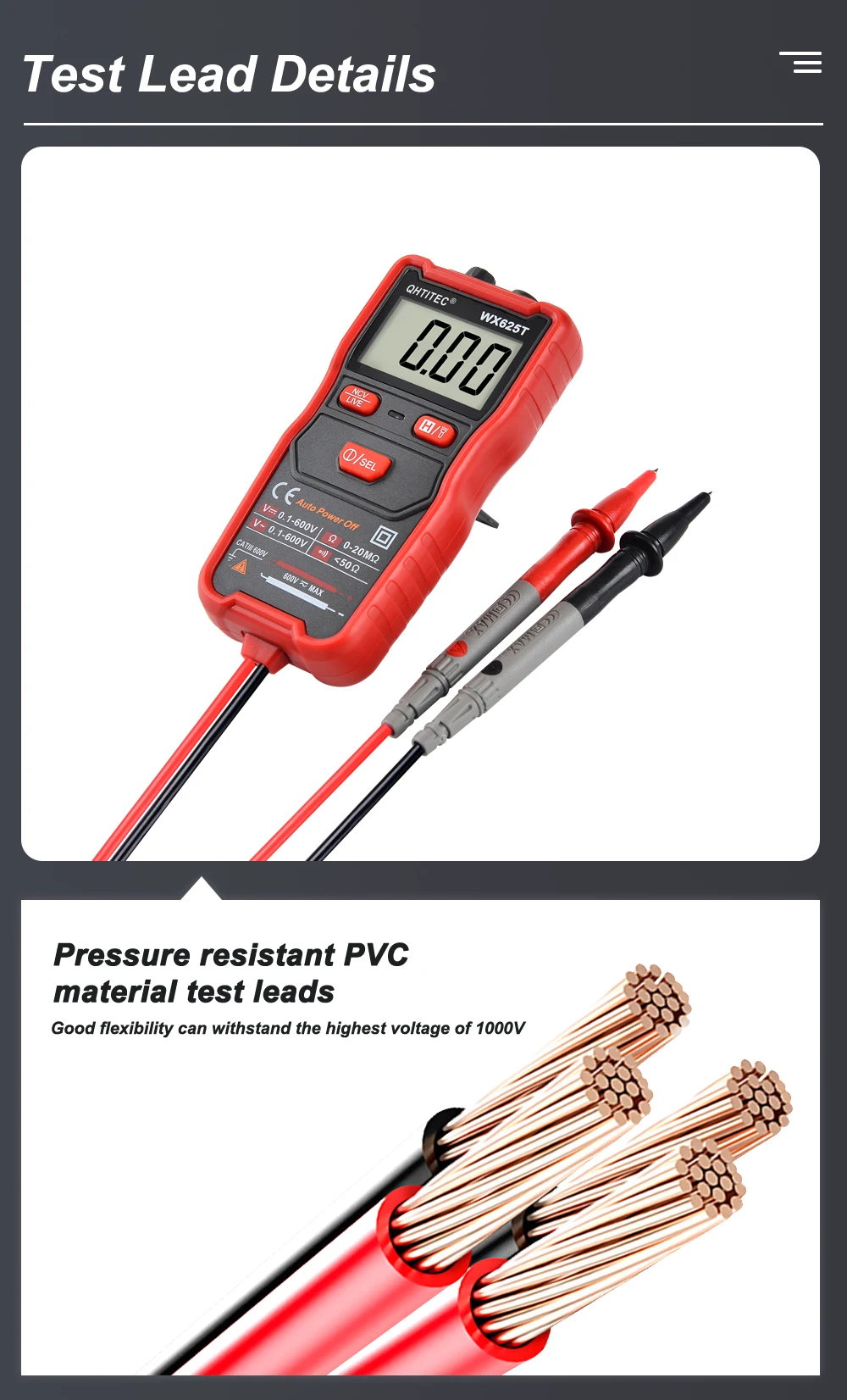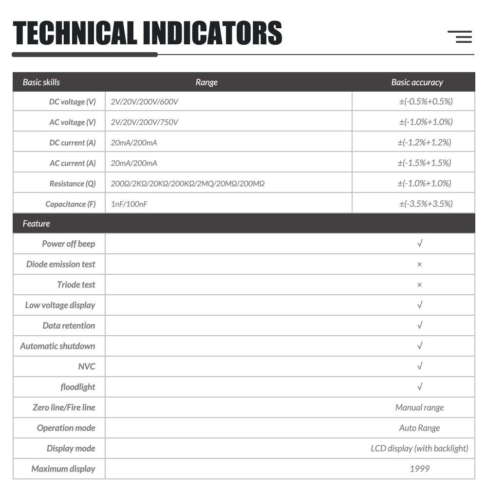 1. Этот измеритель представляет собой портативный цифровой мультиметр. Он имеет стабильную производительность, высокую точность, низкое энергопотребление, новую структуру, безопасность и надежность. Это идеальный счетчик для пользователей.2. Измеритель может измерять напряжение постоянного тока, напряжение переменного тока, сопротивление, непрерывность тестового зуммера; Он имеет функцию Бесконтактного обнаружения напряжения (NCV), незамедлительно напоминая пользователям обратить внимание на безопасную работу, делает пользователей более безопасными и уверенными.3. Этот мультиметр имеет автоматический диапазон, автоматическое отключение (около 15 минут без работы), подсветка, освещение и хранение данных, измерение живого провода, Предупреждение о низком напряжении, Частота дискретизации: около 3 раз в секунду, ЖК-дисплей: 3 1/24. Этот прибор спроектирован и изготовлен в строгом соответствии со стандартом безопасности IEC61010 и соответствует стандарту двойной изоляции и перенапряжения 600 В CAT III