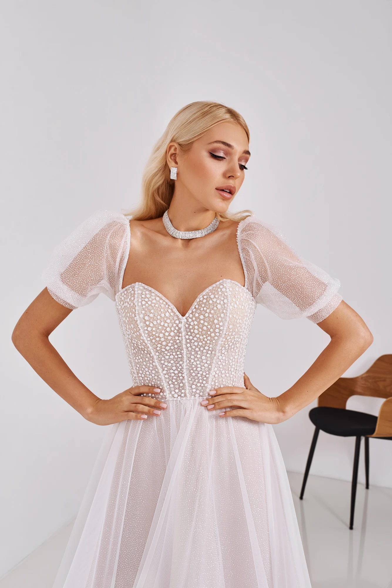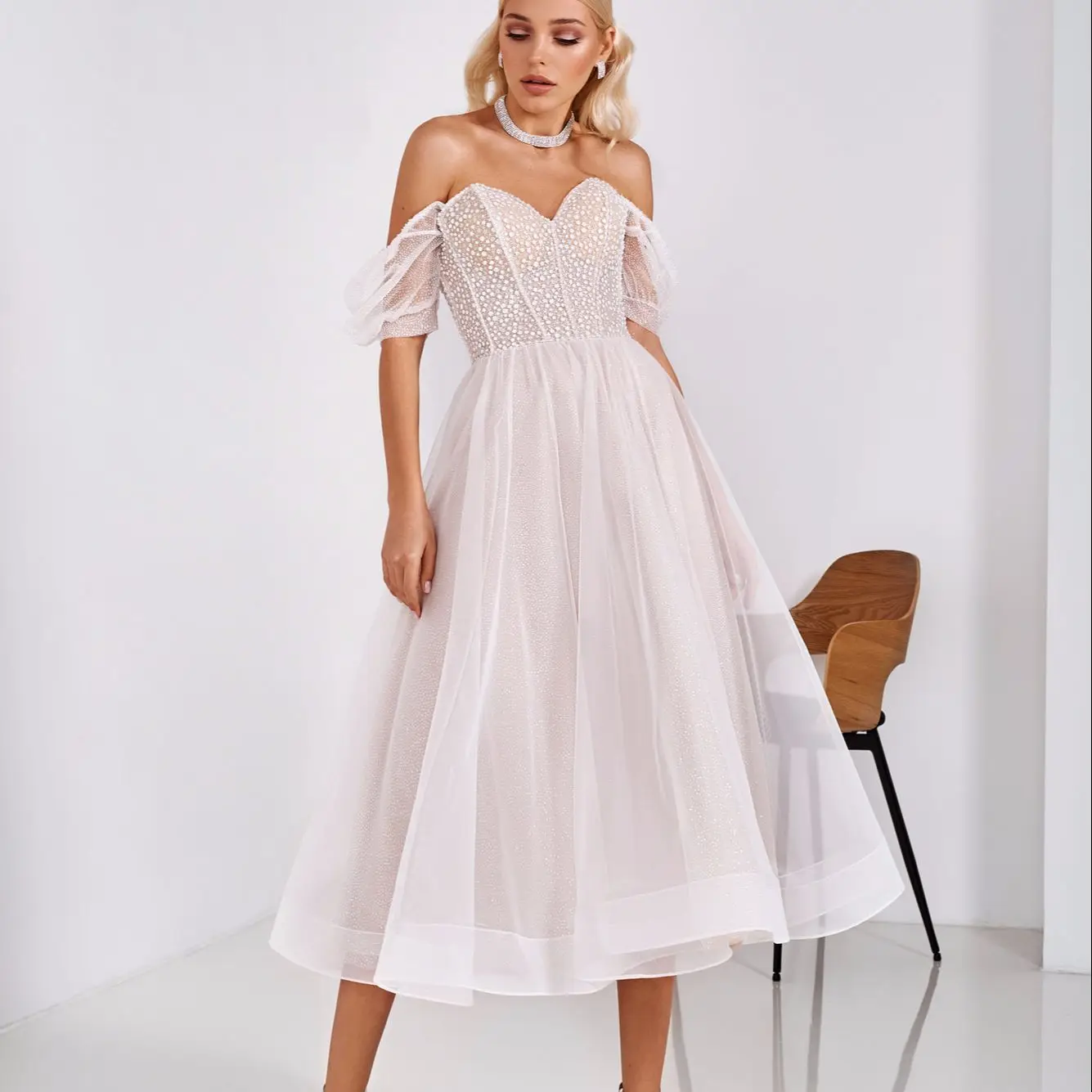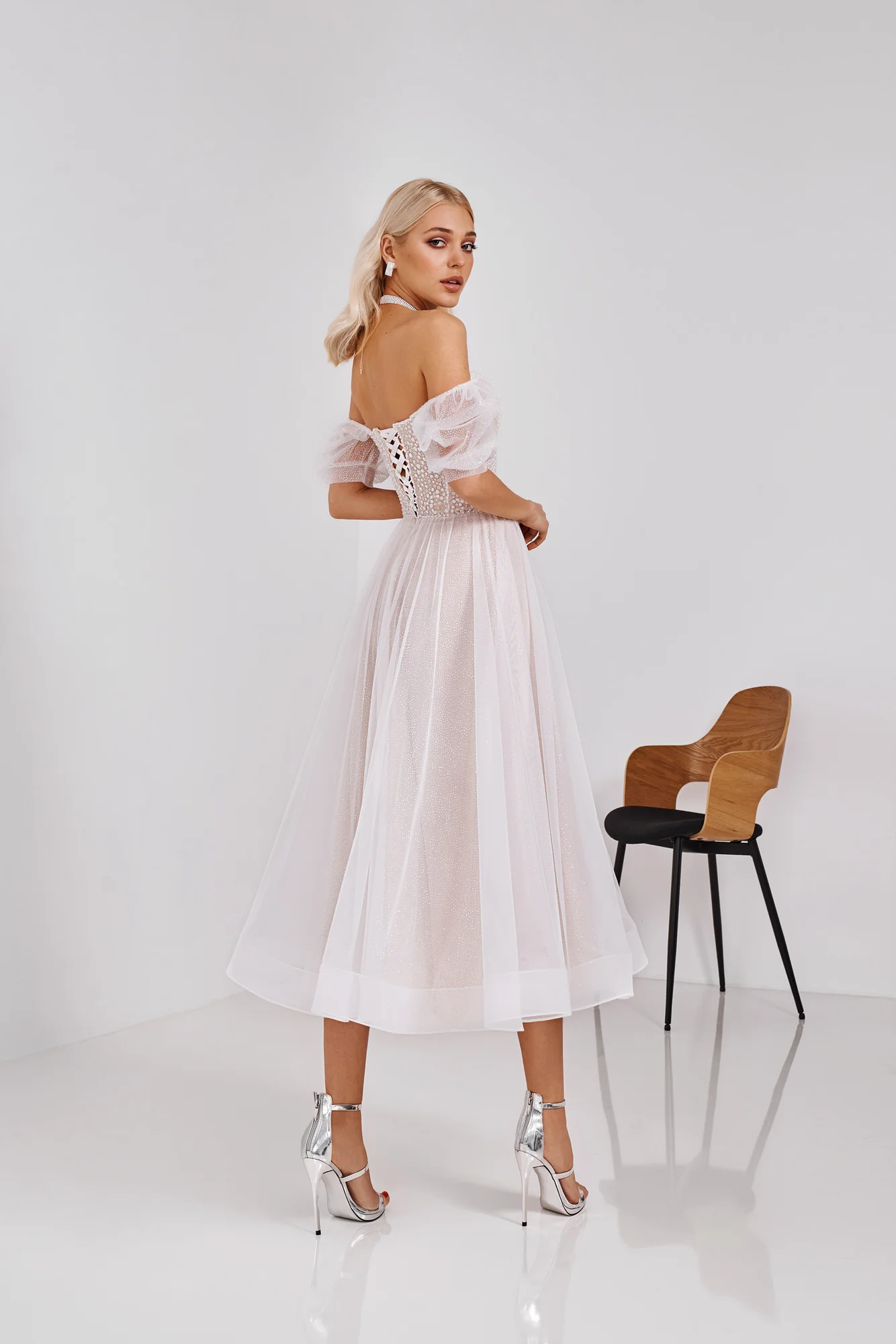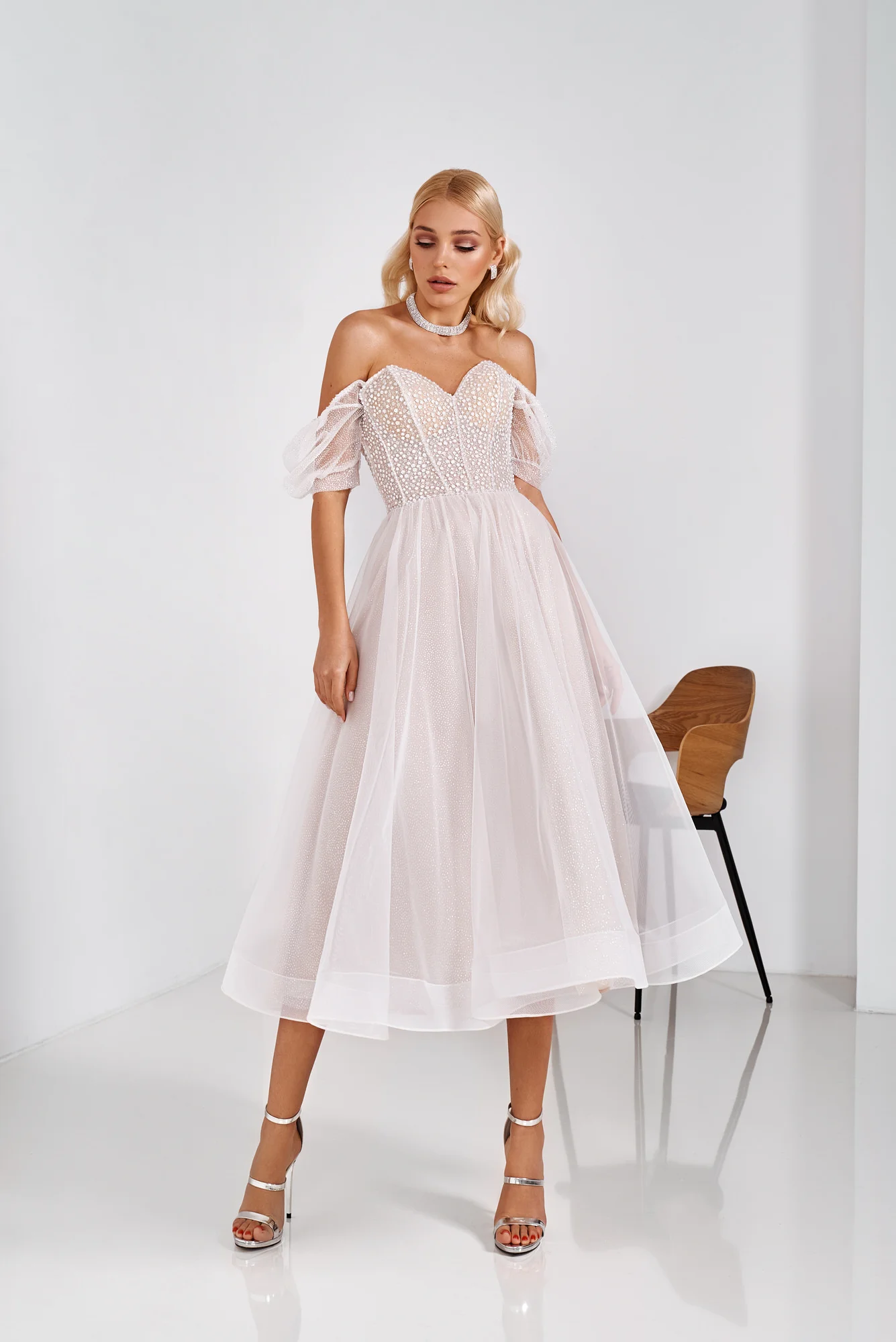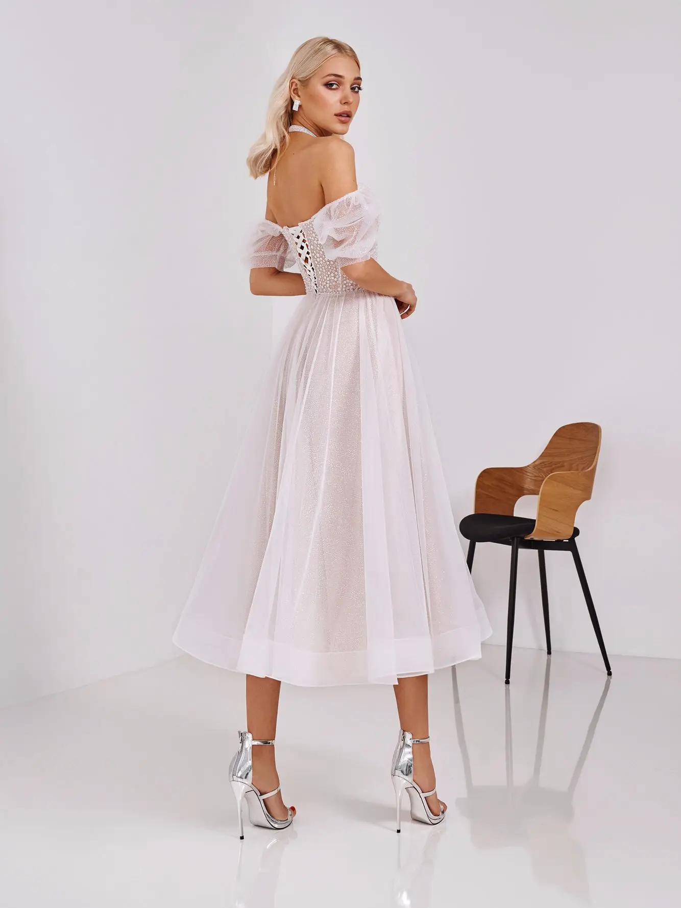 Романтическое элегантное платье невесты из фатина в горошек с откры...