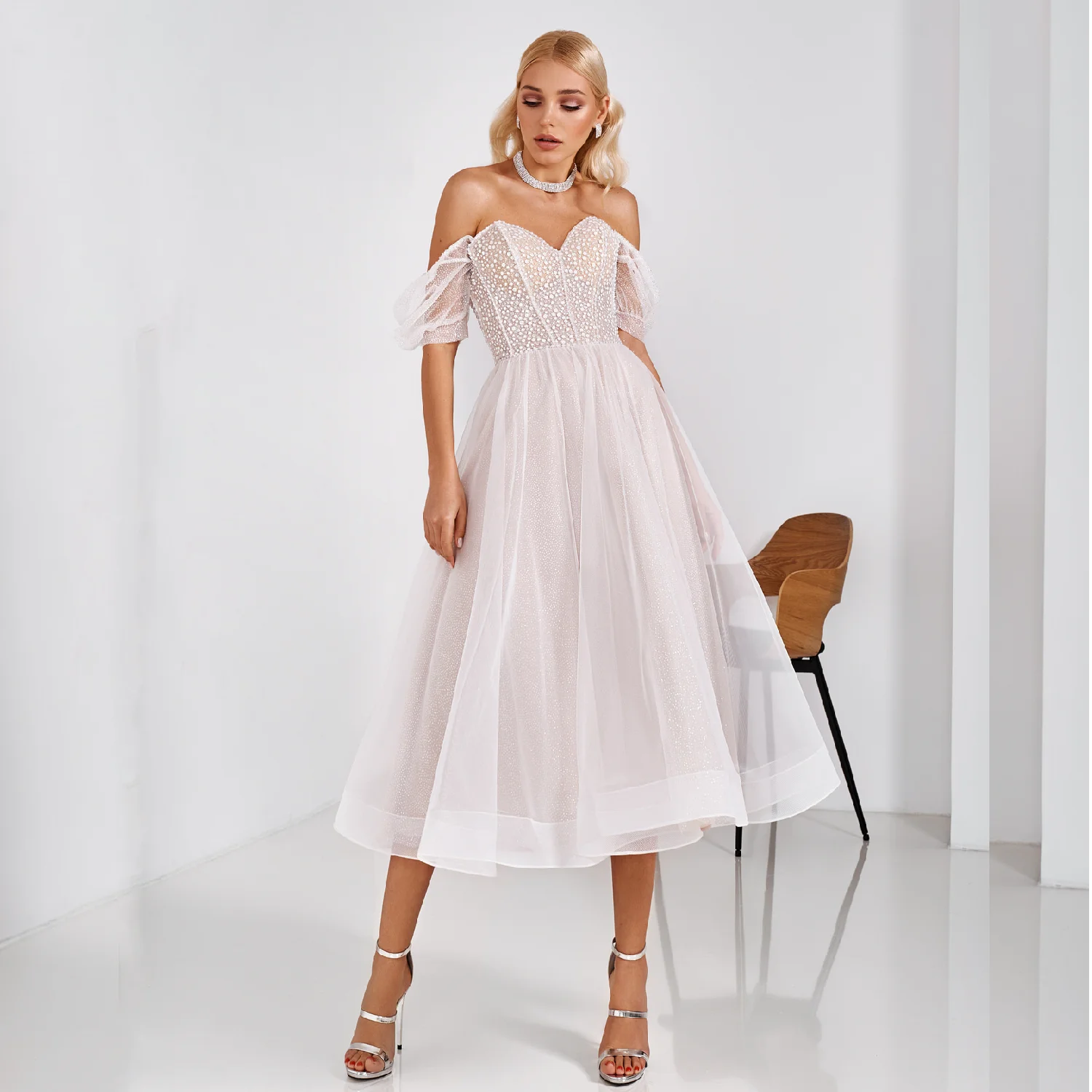 Свадебное платье, короткое элегантное платье невесты длиной до сере...