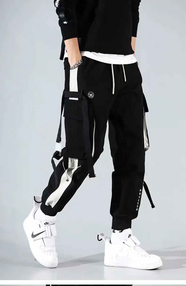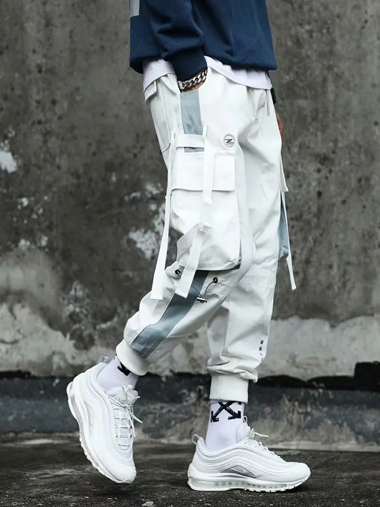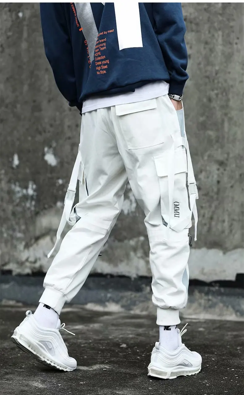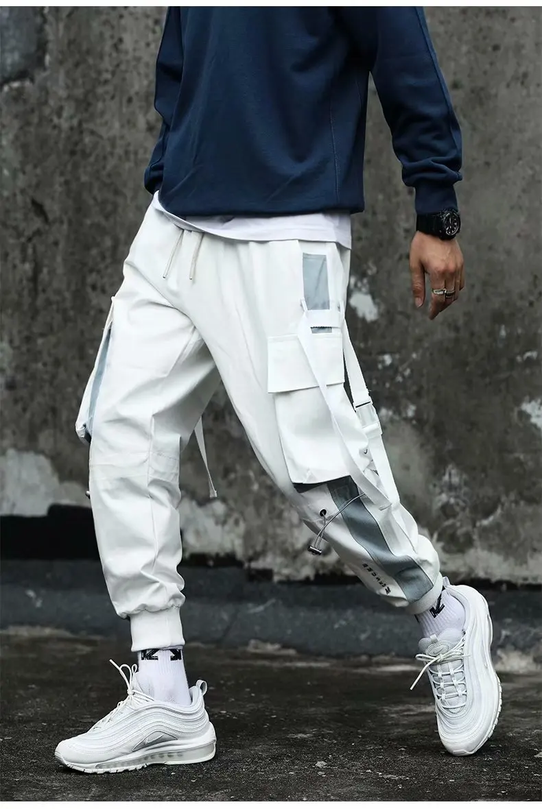 Брюки-карго мужские белые, в Корейском стиле, с лентами