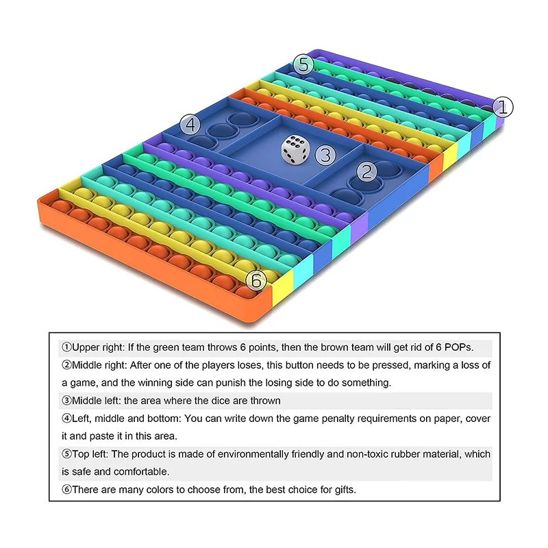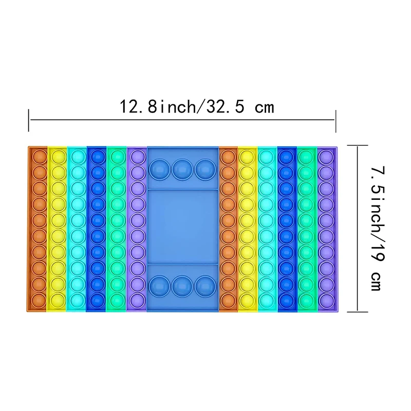Размер: 32,5x19 см/12,8x7, 5 дюймовМатериал: силиконЦвет: яркий цвет радугиФорма: большой прямоугольникПосылка включает в себя:1X большая игрушка Непоседа2X кости