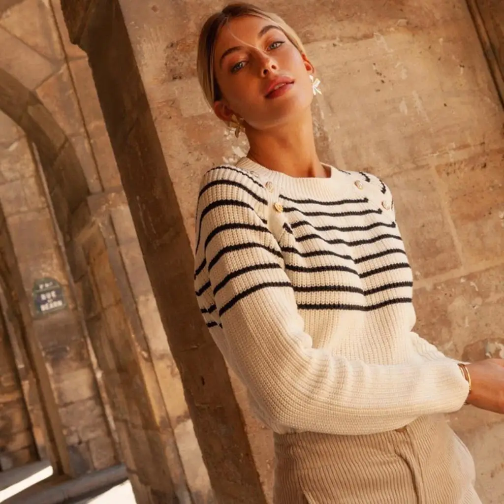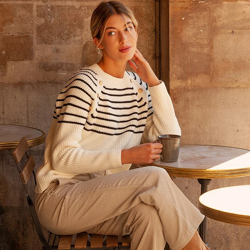 Пуловер женский трикотажный в полоску, свитер с длинным рукавом и круглым вырезом в винтажном стиле, джемпер в стиле ретро, топ на осень-зиму
