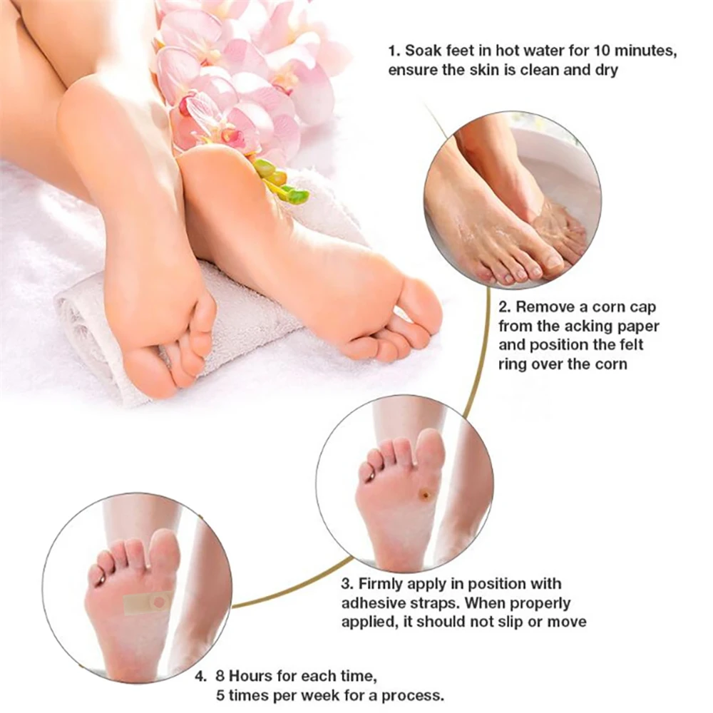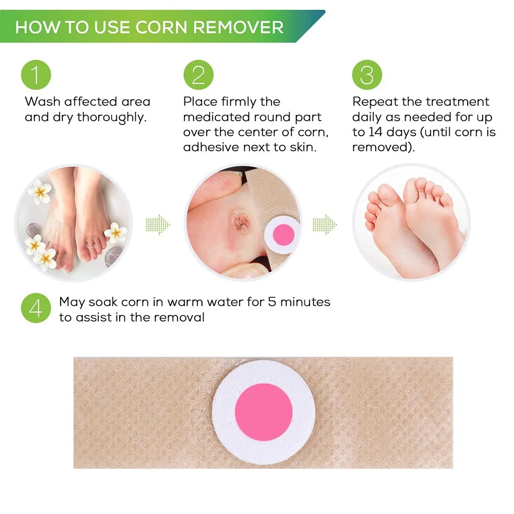 Уведомления при использовании Пластыри для ног:1. Внешнее использование только для взрослых старше 16 лет.2. Замочите ноги в горячей воде в течение 10 минут перед использованием.3. Ежедневно наносите свежую штукатурку (6-10 часов) до тех пор, пока кукуруза не будет удалена.4. Лечение может быть продолжено в течение 2 недель, если только по поручению врача