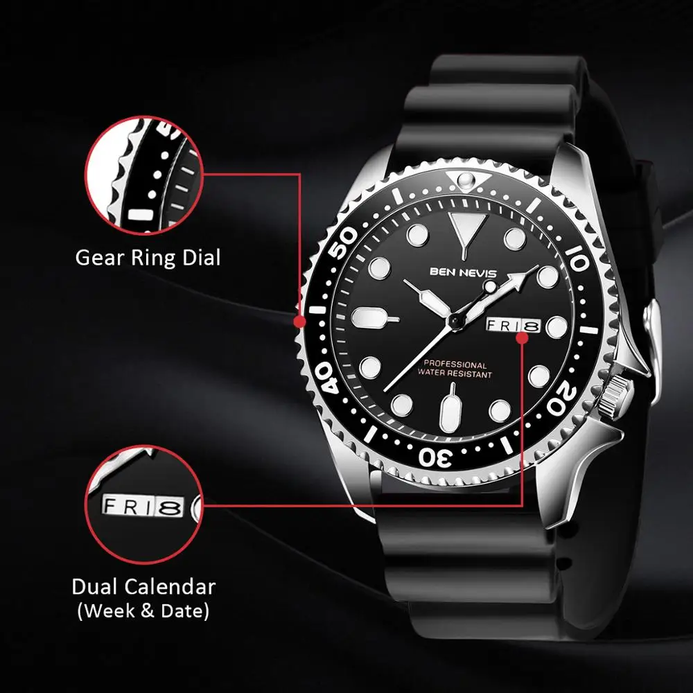 Описание:-100% новый с биркой и высоким качеством;-Топ бренд класса люкс высокого качества дизайн циферблата, функция отображения даты;-Отображение даты и часов-Японский кварцевый механизмХарактеристики:-Чехол Диаметр: 44 мм-Чехол Толщина: 13 мм-Длина ремешка: 260 мм-Ширина ремешка: 22 мм-Материал корпуса: нержавеющая сталь-Материал ремешка: силиконовая лентаПосылка включает в себя:-Часы Ben Nevis-1 шт.